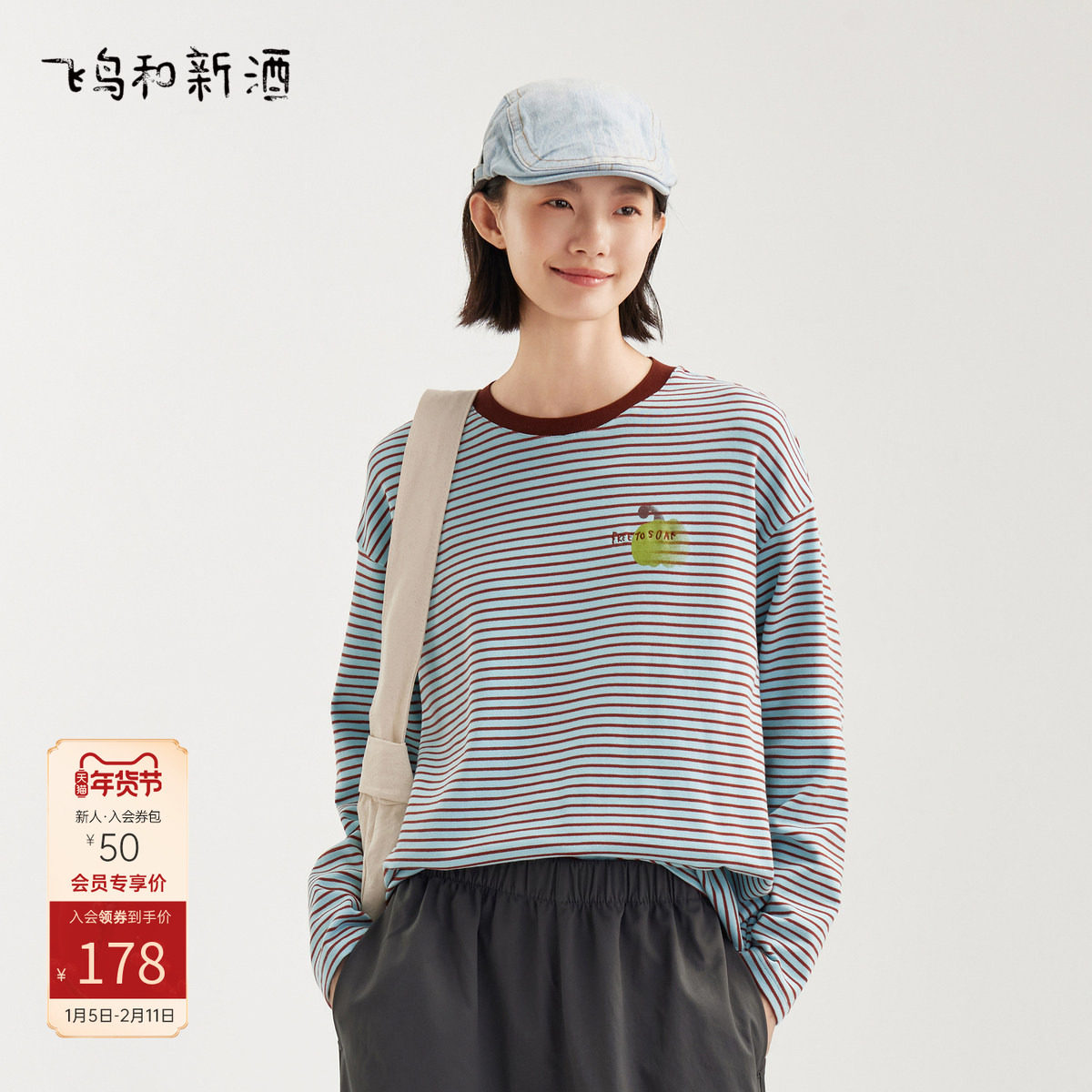 飞鸟和新酒撞色刺绣条纹T恤女秋季新款短款宽松复古圆领长袖上衣