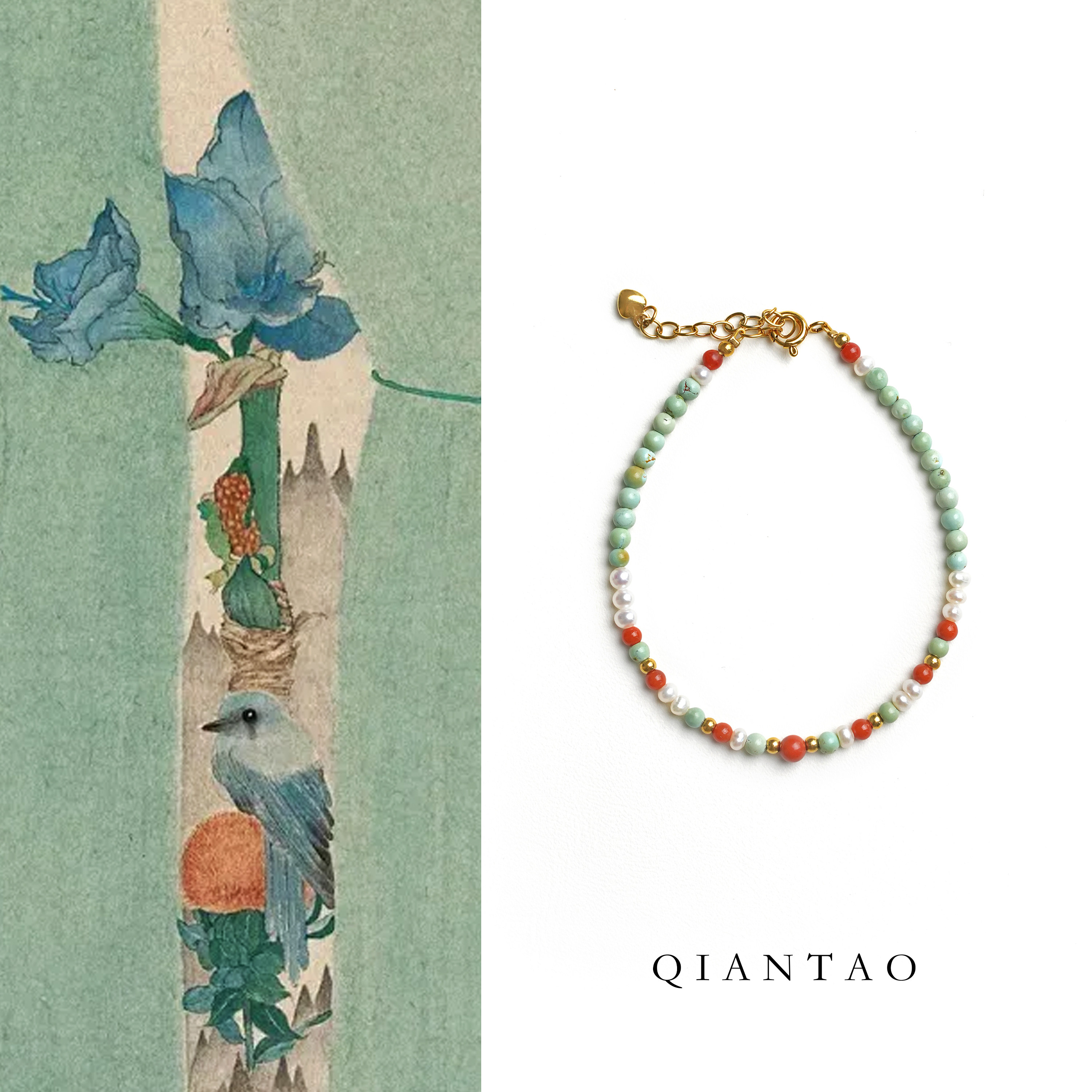 QIANTAO「池梦鲤」原创国风中式天然原矿绿松石文艺手链手串礼物