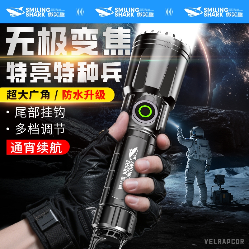 微笑鲨多功能强光手电筒充电家用便携超长续航大容量耐用led照明