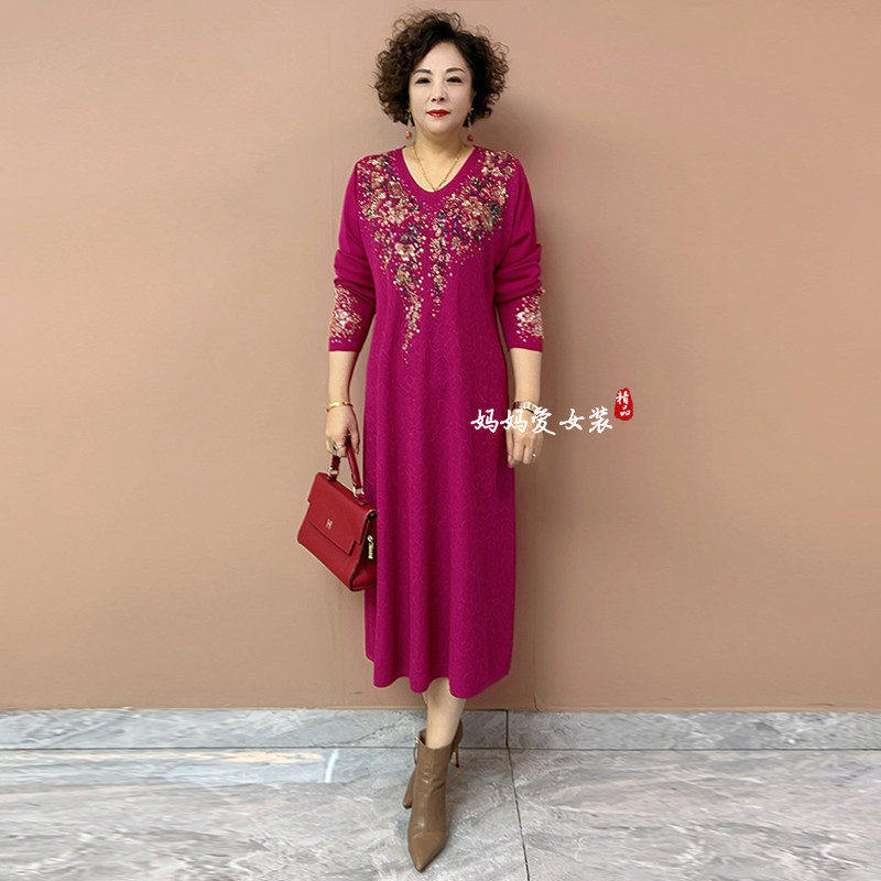 高贵气质妈妈重工烫钻刺绣针织连衣裙时尚长款宽松遮肉大码毛衣裙
