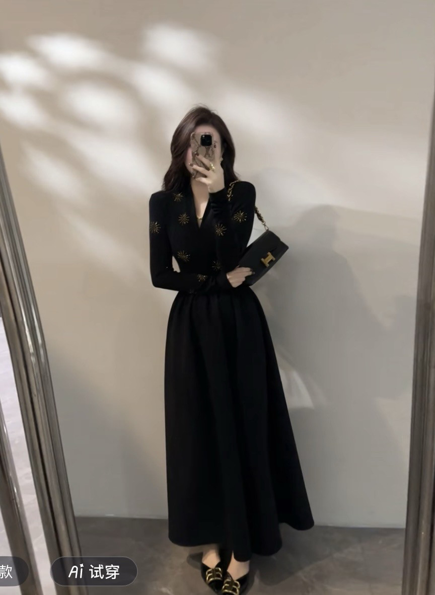 2025新款v领假两件刺绣针织连衣裙女春秋冬收腰气质小黑裙子