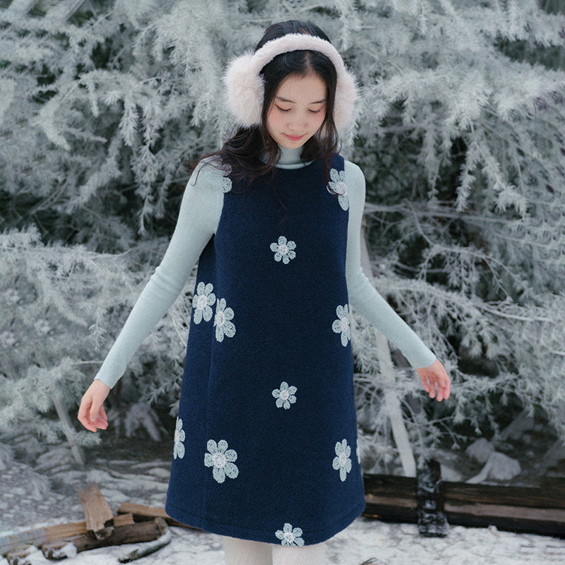 blushwhite 小兰花刺绣藏青色无袖连衣裙/针织半身裙/夹克套装