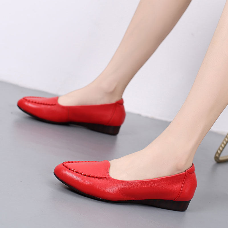 2025秋季新款平底女士单鞋真皮软底软皮浅口豆豆鞋大码红色妈妈鞋