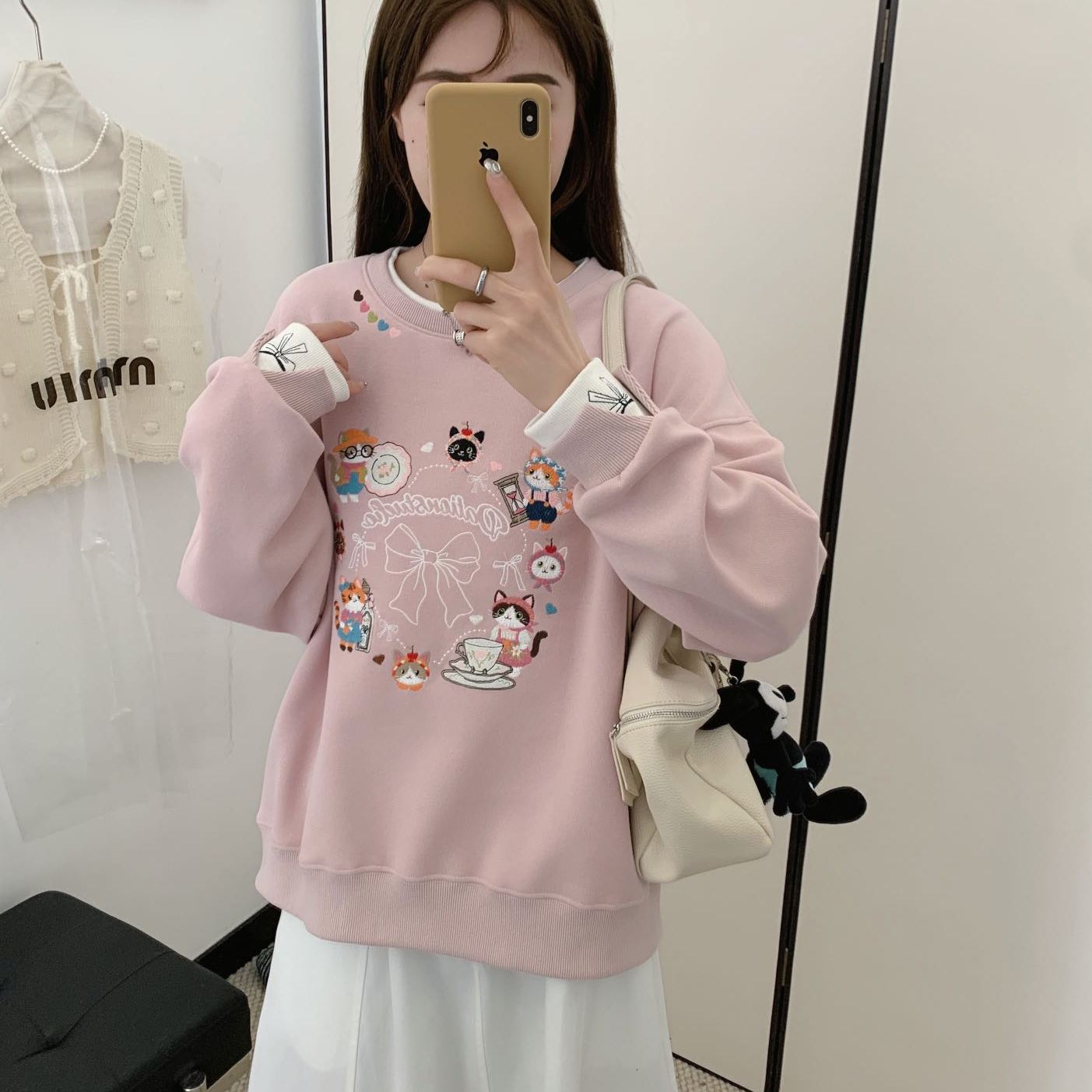 【3620】新款时尚百搭刺绣奶乖系拼色圆领长袖常规卫衣印花秋冬