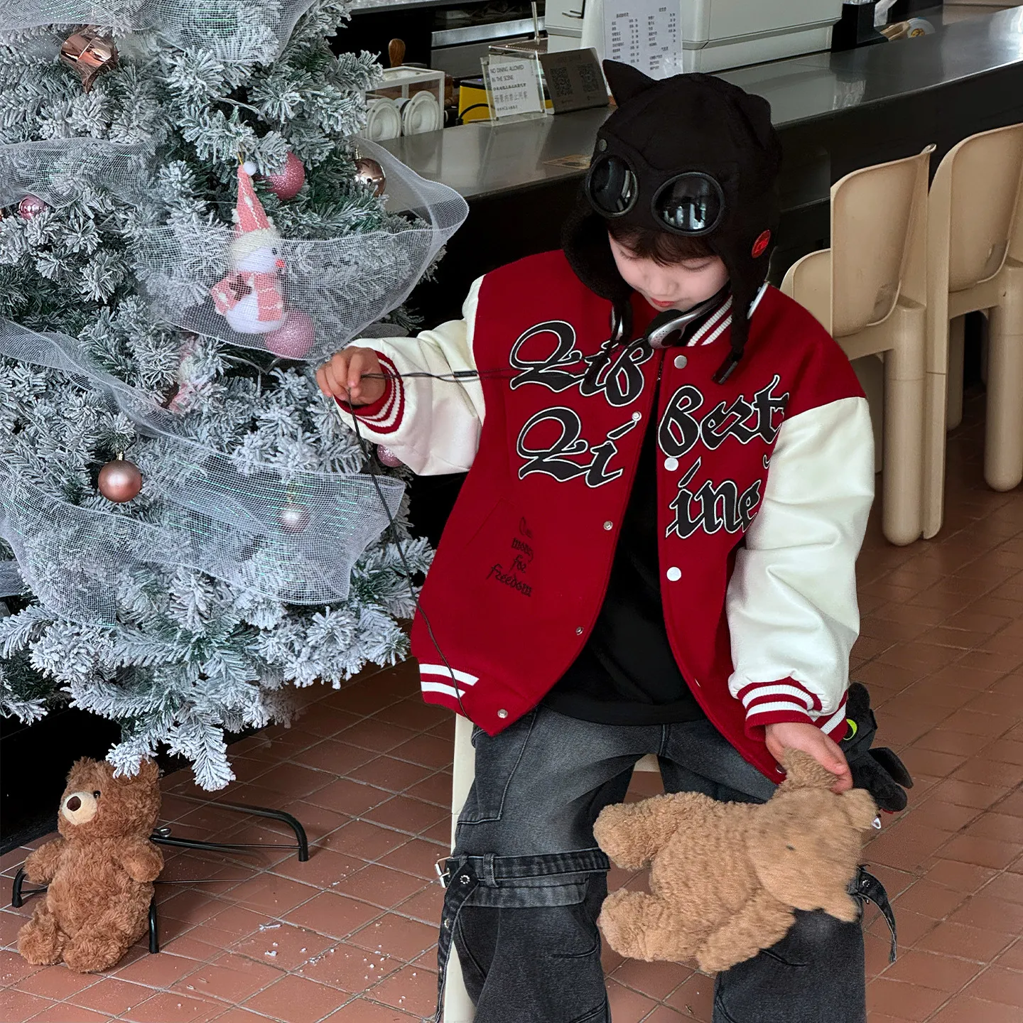 儿童字母刺绣印花拼色绗棉加厚长袖棒球服冬季男童休闲单排扣外套