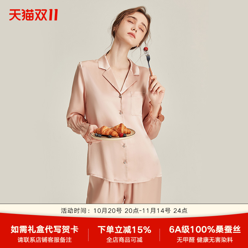 美标真丝长袖睡衣女士家居服100%桑蚕丝套装宽松可外穿丝绸家居服