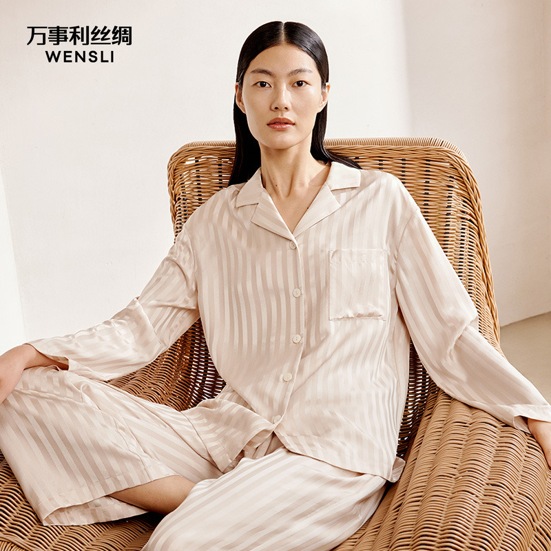 万事利2025年度新品真丝长袖睡衣女条纹家居服可外穿套装畅想