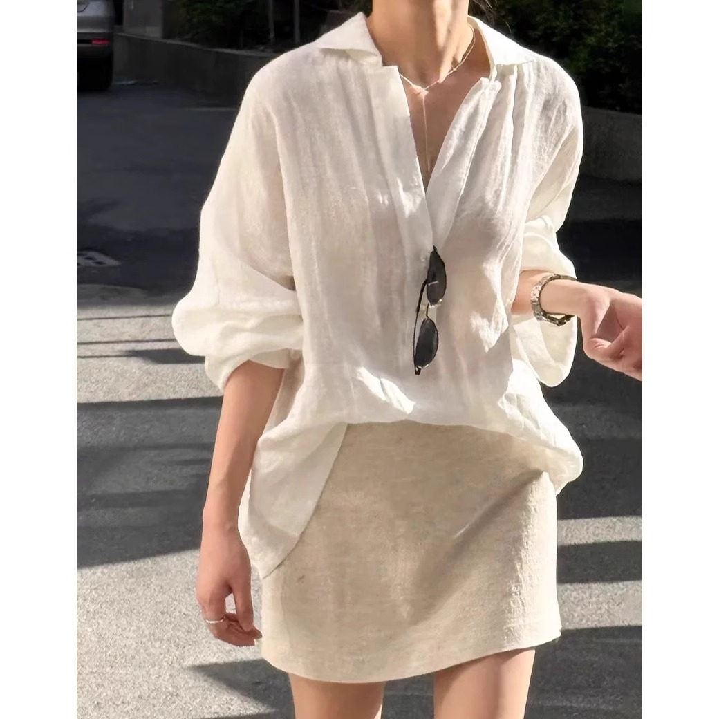 法式白色亚麻衬衫女夏季薄款宽松气质老钱风高端棉麻衬衣防晒上衣