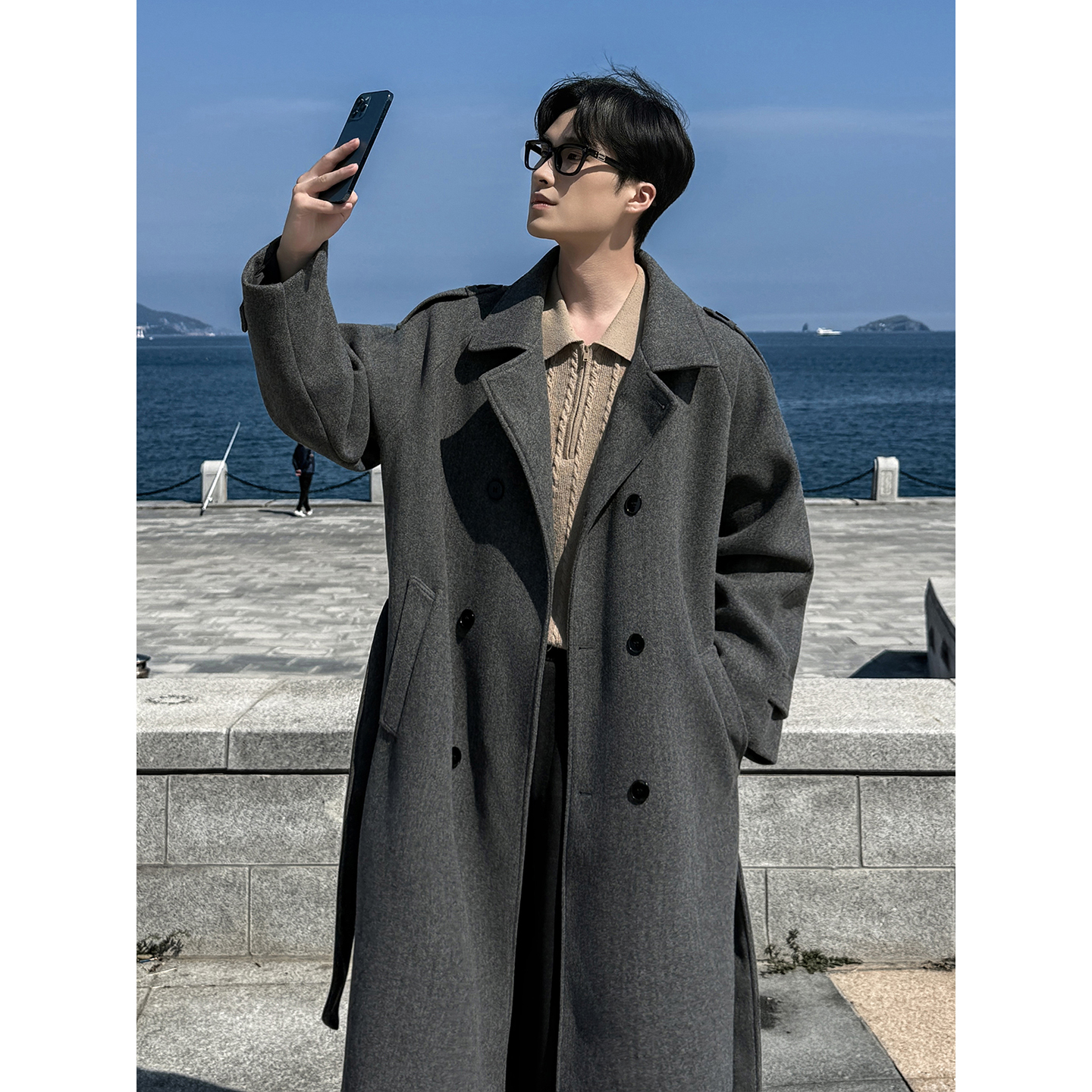 韩系高级感灰色大衣男中长款过膝毛呢外套雅痞英伦风呢子加厚风衣