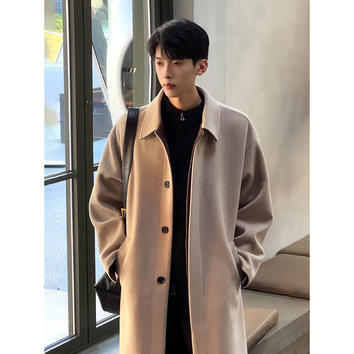 卡其色创驳领西装毛呢外套男秋冬加厚呢子大衣中长款韩系英伦风衣