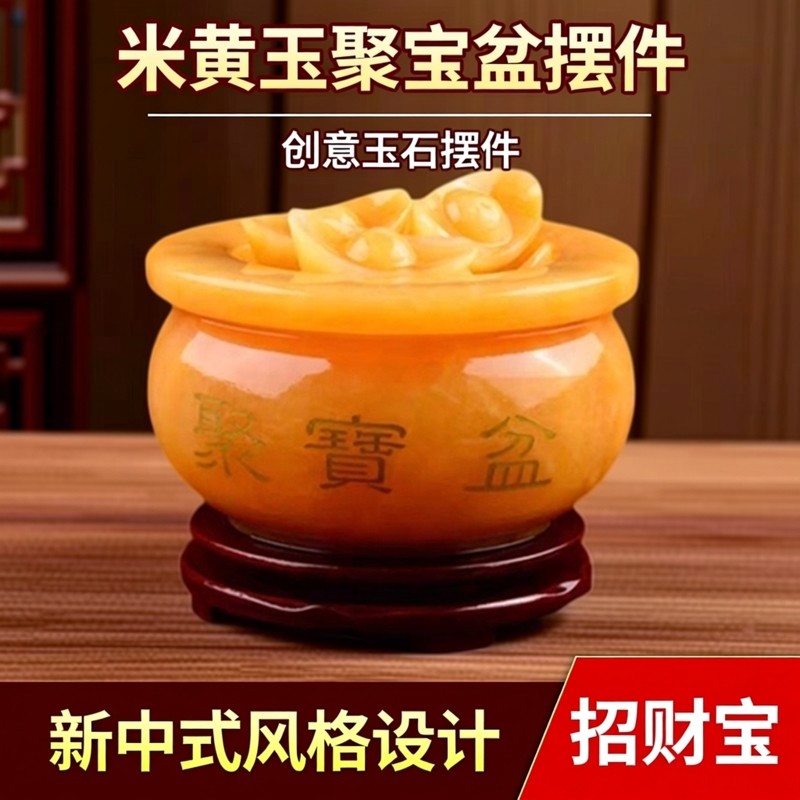 玉石聚宝盆摆件天然黄玉招财进宝客厅玄关前台装饰新中式开业礼品