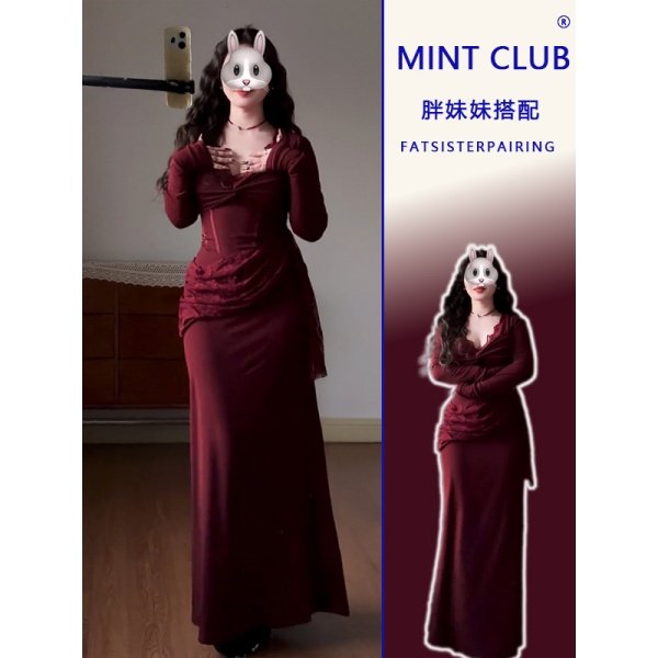 大码胖MM气质复古蕾丝拼接显瘦长袖连衣裙红色深V领修身长裙女装