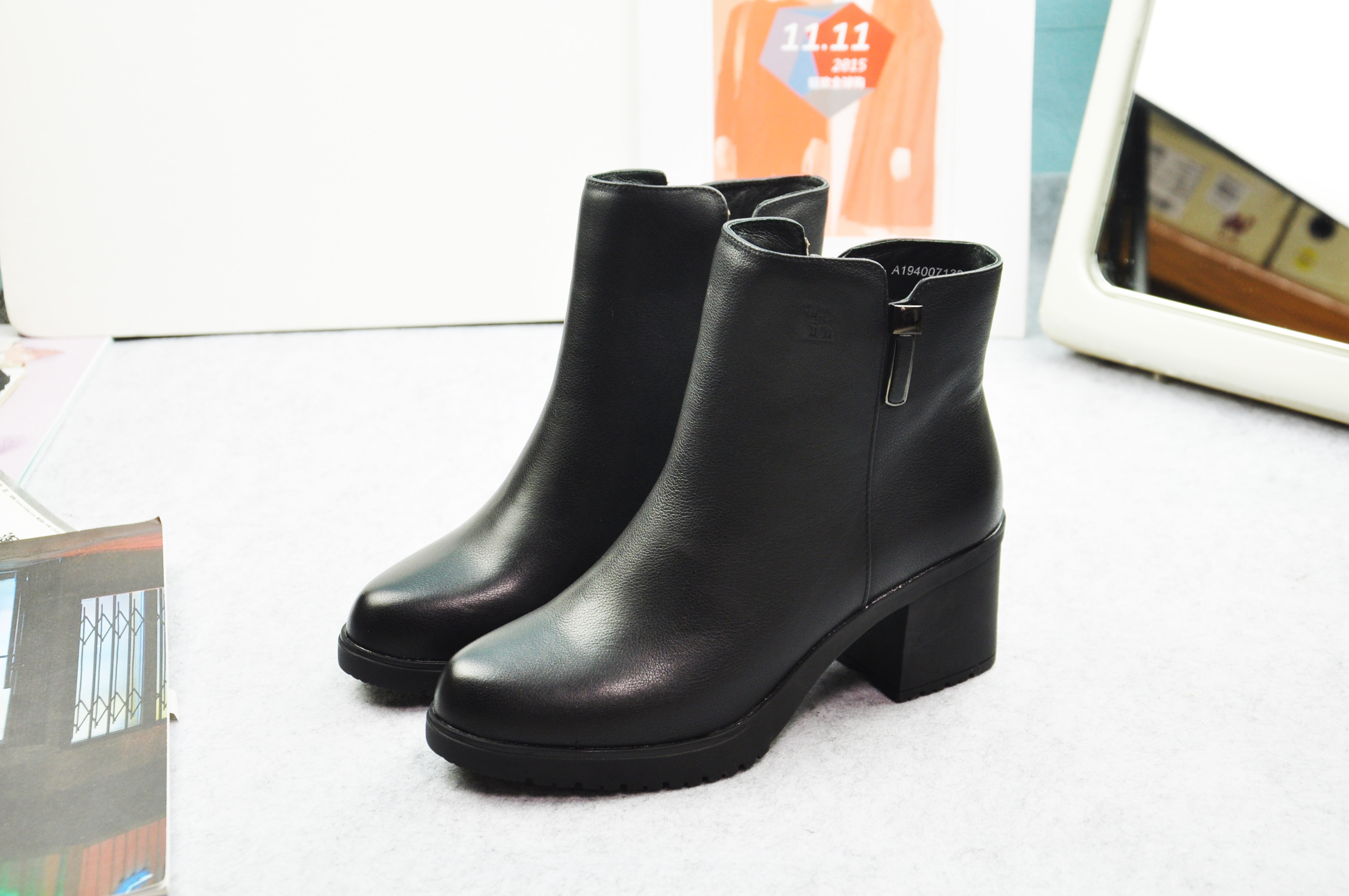 - 粗跟短靴加绒