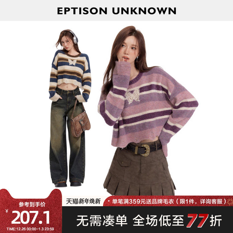 【明星同款】EPTISON毛衣女2025秋季新款复古短款条纹宽松针织衫