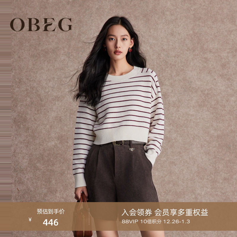OBEG欧碧倩复古长袖针织衫短款条纹套头毛衣上衣女冬季10484042
