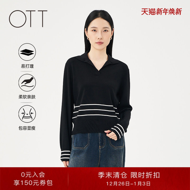OTT2025春季新款黑色翻领套头毛针织衫女条纹袖口短款毛衫V领毛衣