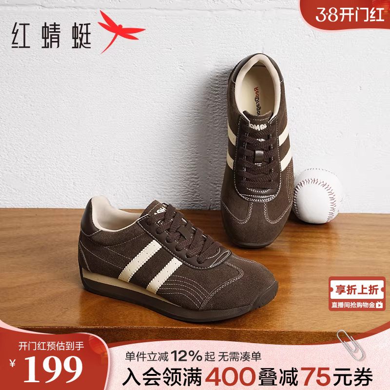 红蜻蜓红色德训鞋女春秋女鞋鞋子平底系带休闲板鞋百搭运动阿甘鞋