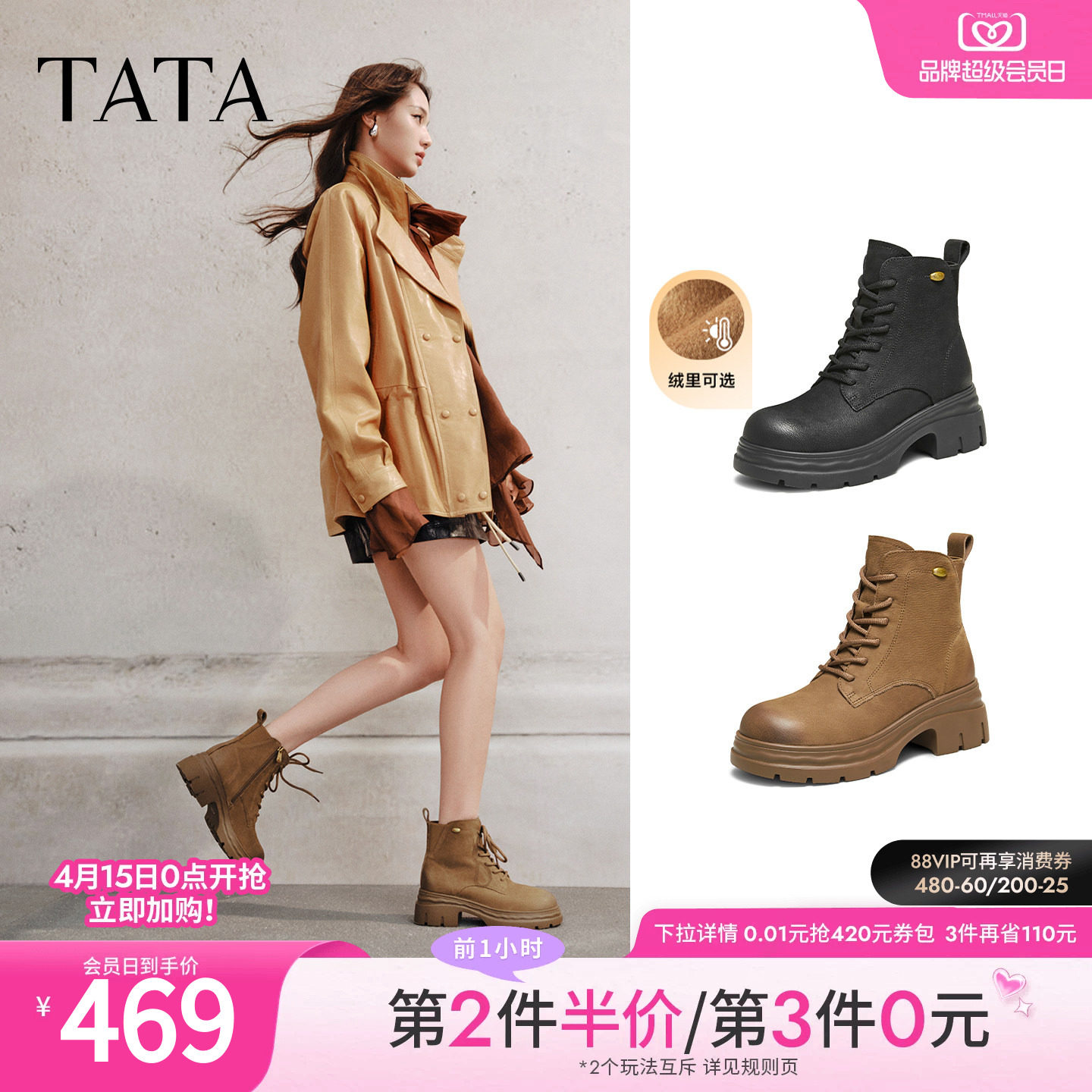 TATA他她靴子女百搭马丁靴新款黑色短筒靴厚底工装靴CCJ08DD5奥莱