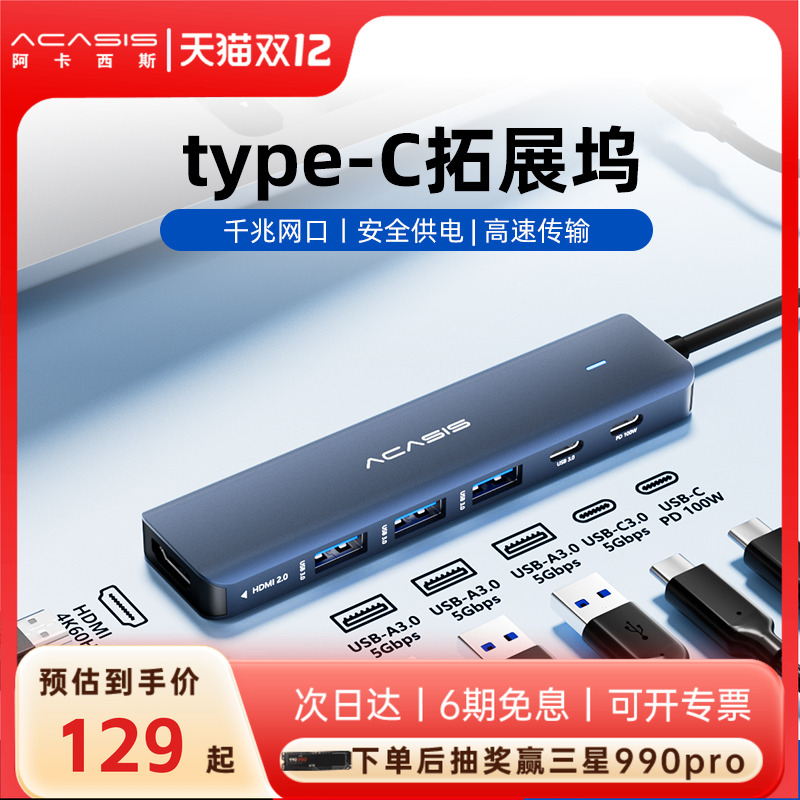 阿卡西斯拓展坞typec扩展hdmi投屏转换usb集线器适用MACbook笔记本电脑平板手机转接头pd供电转换器