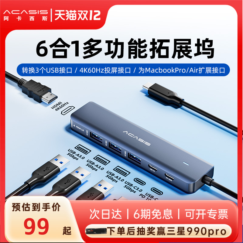 阿卡西斯usb拓展坞插头多口分线器typec分线器hdmi投屏转换适用苹果MacbookPro/AirM4mini电脑