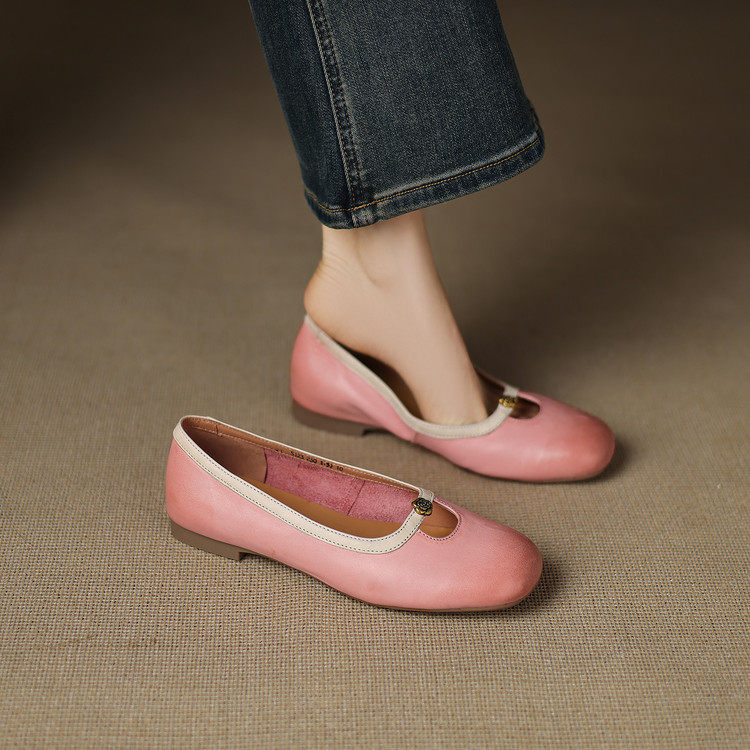 头层牛皮~~方头浅口一字带玛丽珍鞋气质女鞋手工平跟单鞋软底软面