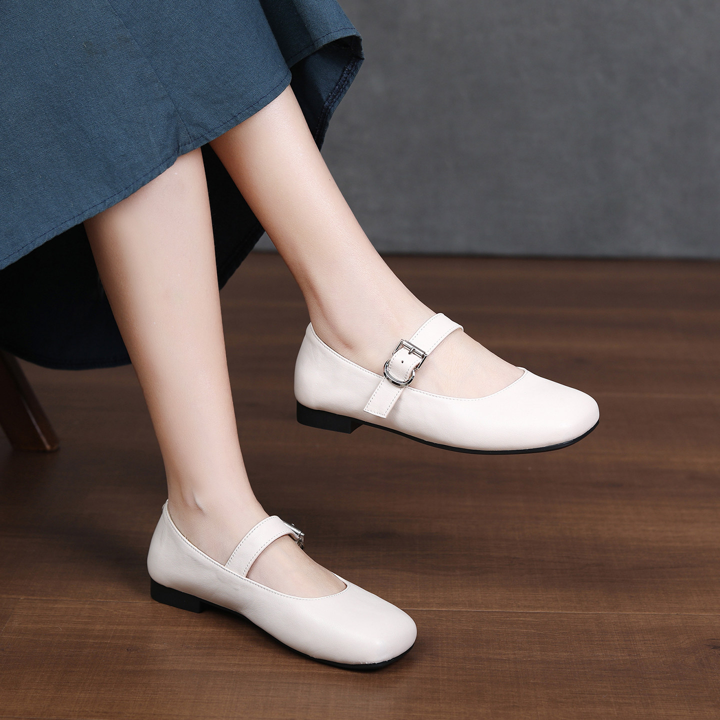 扣带单鞋2026春季新款真皮复古圆头浅口软皮软底平跟懒人单鞋女