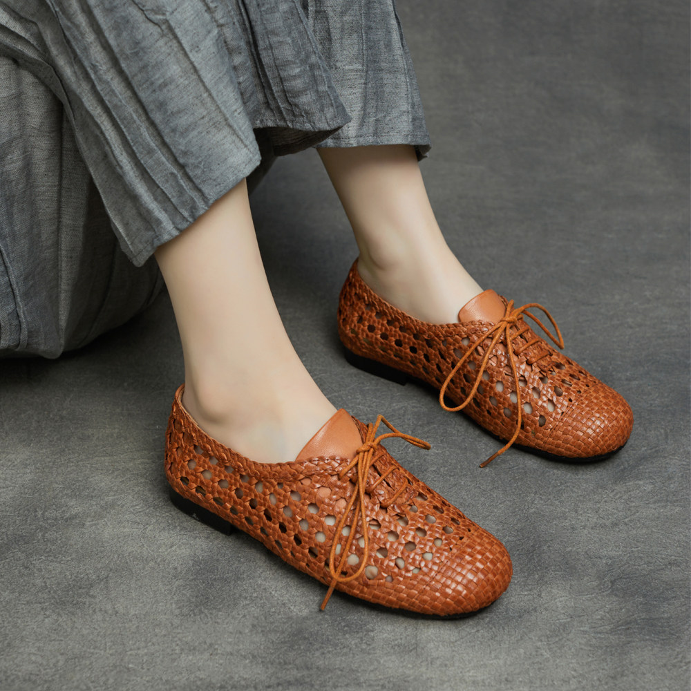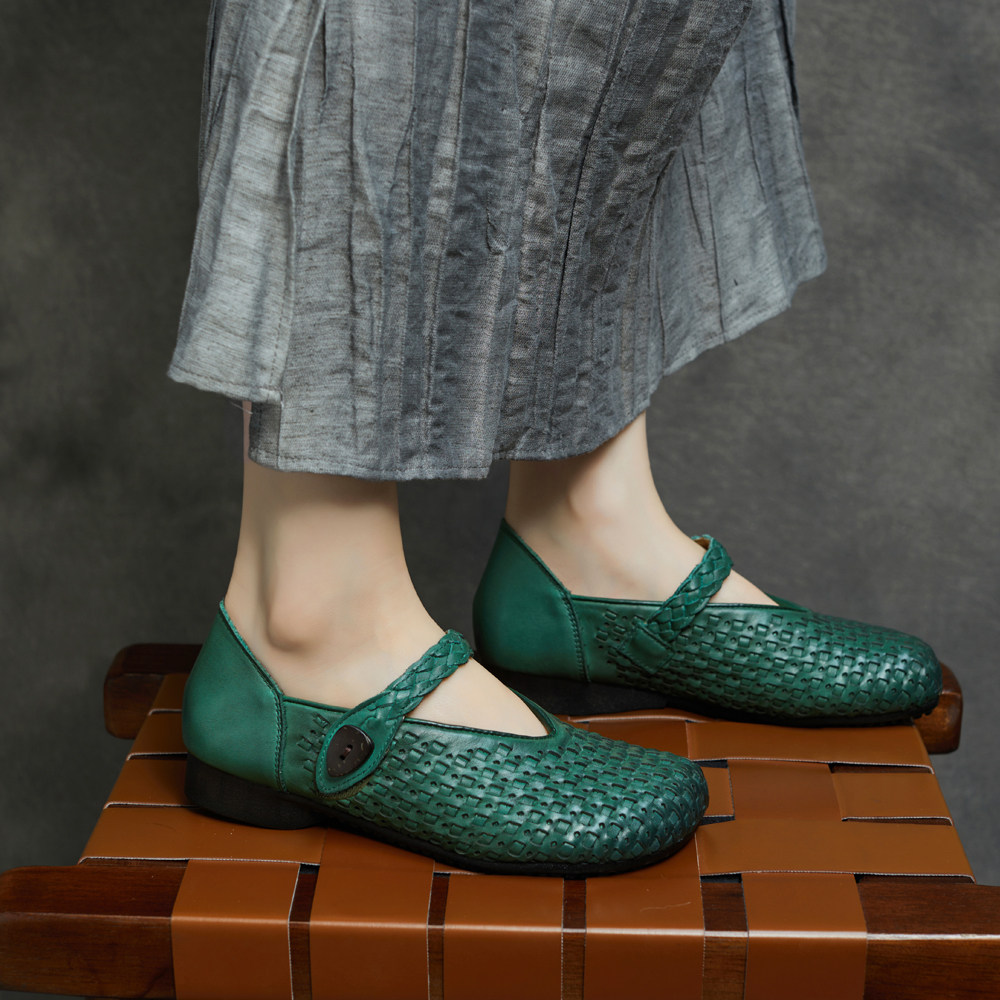 编织镂空单鞋2026春夏新款真皮圆头复古V型鞋口平跟鞋浅口单鞋女