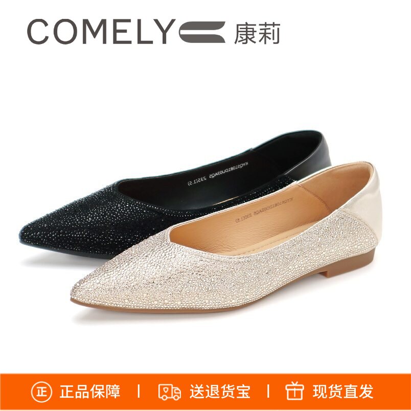 COMELY康莉2026尖头平跟真皮浅口水钻单鞋复古百搭通勤女KYQ51081