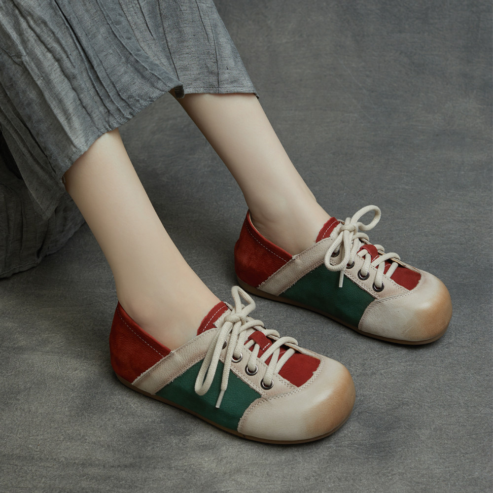 拼色单鞋2026春季新款圆头英伦风真皮系带平跟浅口休闲鞋低帮女鞋