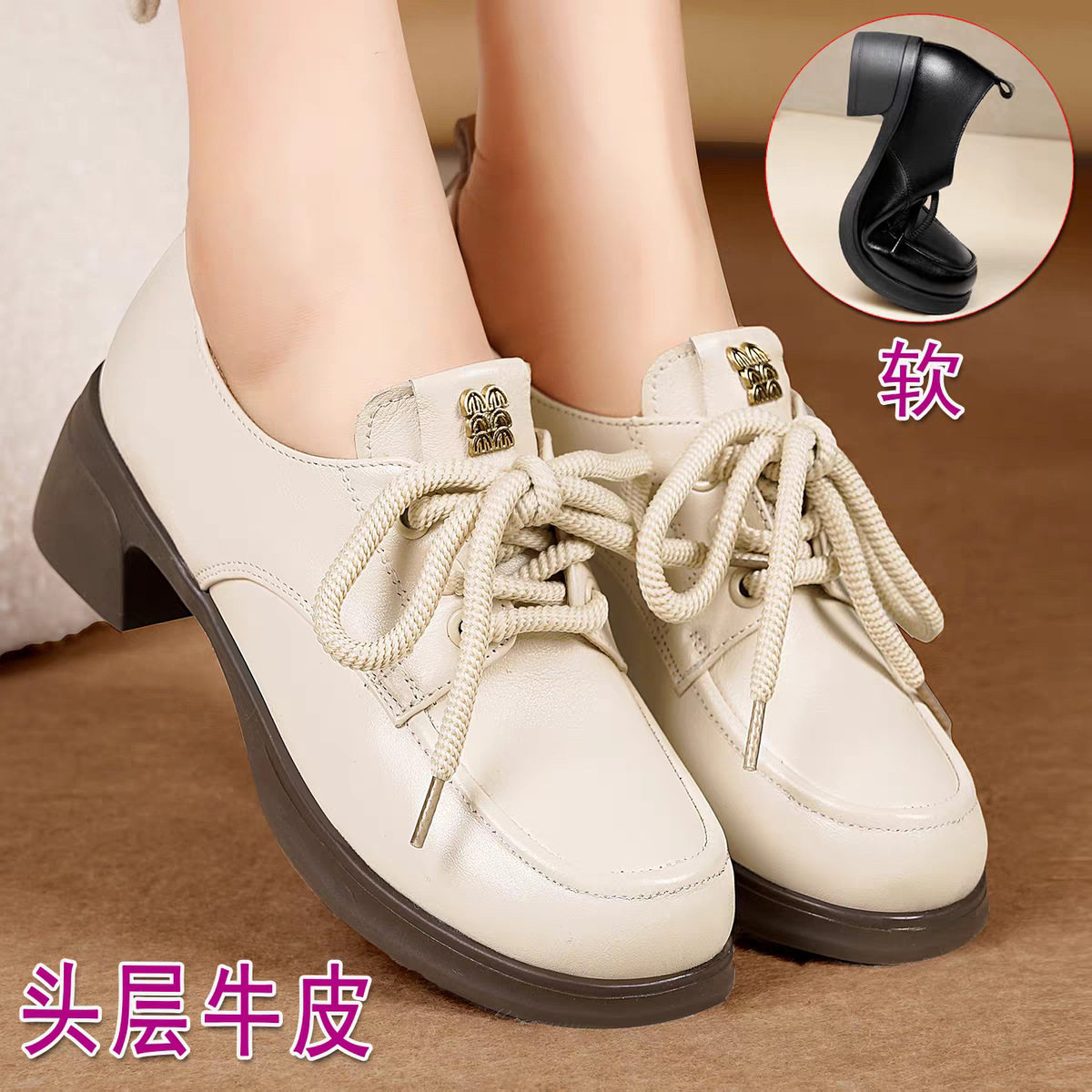 新款真皮女鞋中年女士皮鞋系带高跟鞋单鞋中跟厚底乐福鞋软底白色