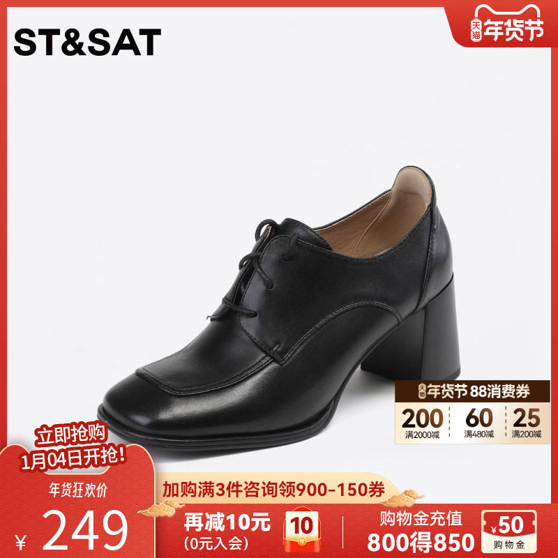 星期六粗跟系带皮鞋秋季方头高跟踝靴深口通勤单鞋SS33112237