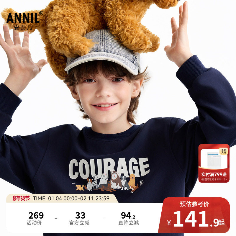 安奈儿童装男童圆领长袖卫衣2026春新款时尚印花学院风轻薄弹力