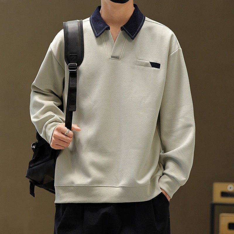 秋冬季POLO衫男卫衣撞色翻领男士美式复古潮牌长袖T恤重磅v领秋装