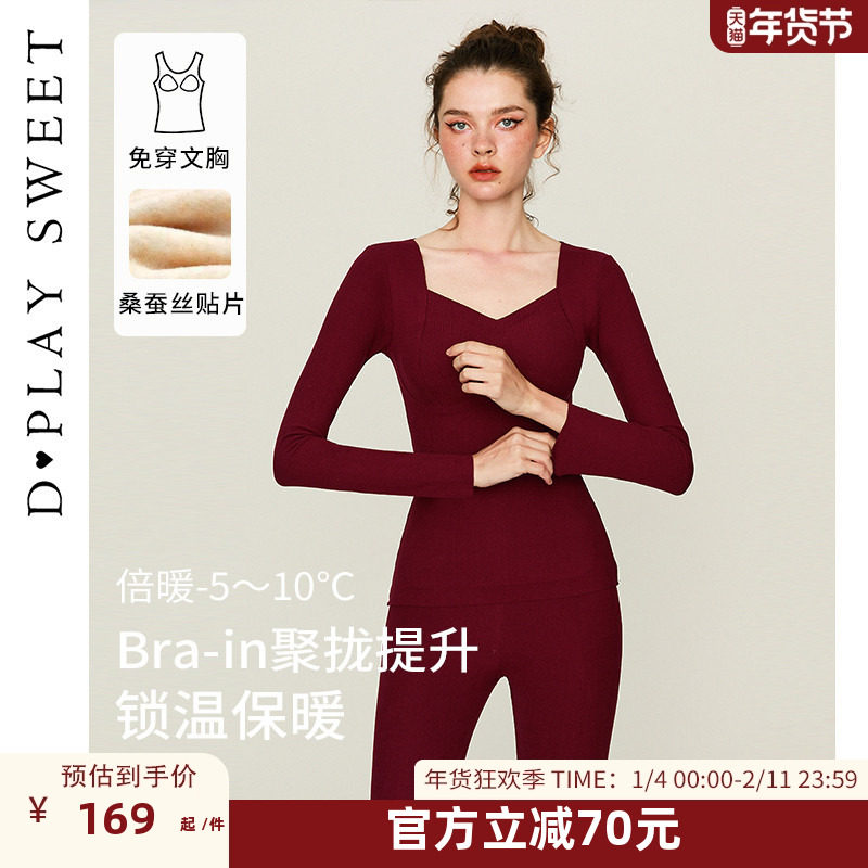 DPLAYSWEET无痕磨毛保暖套装红色秋衣秋裤亲肤一体杯V领内衣新品
