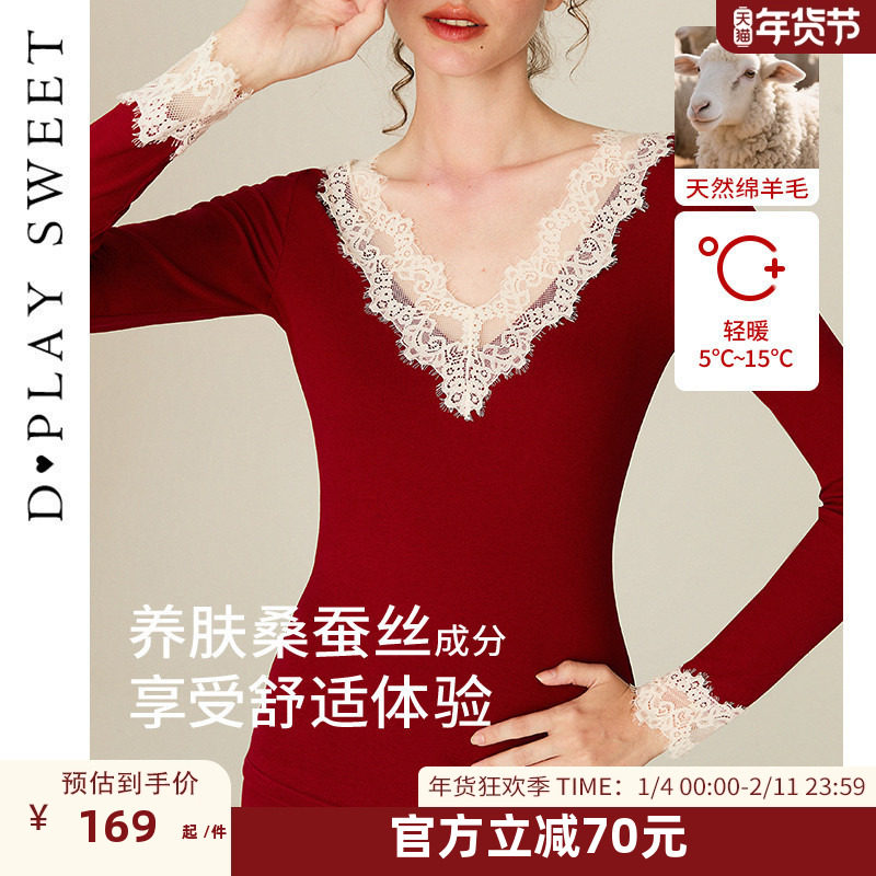 DPLAYSWEET红色本命年保暖内衣秋衣秋裤套装V领蕾丝磨毛两件套