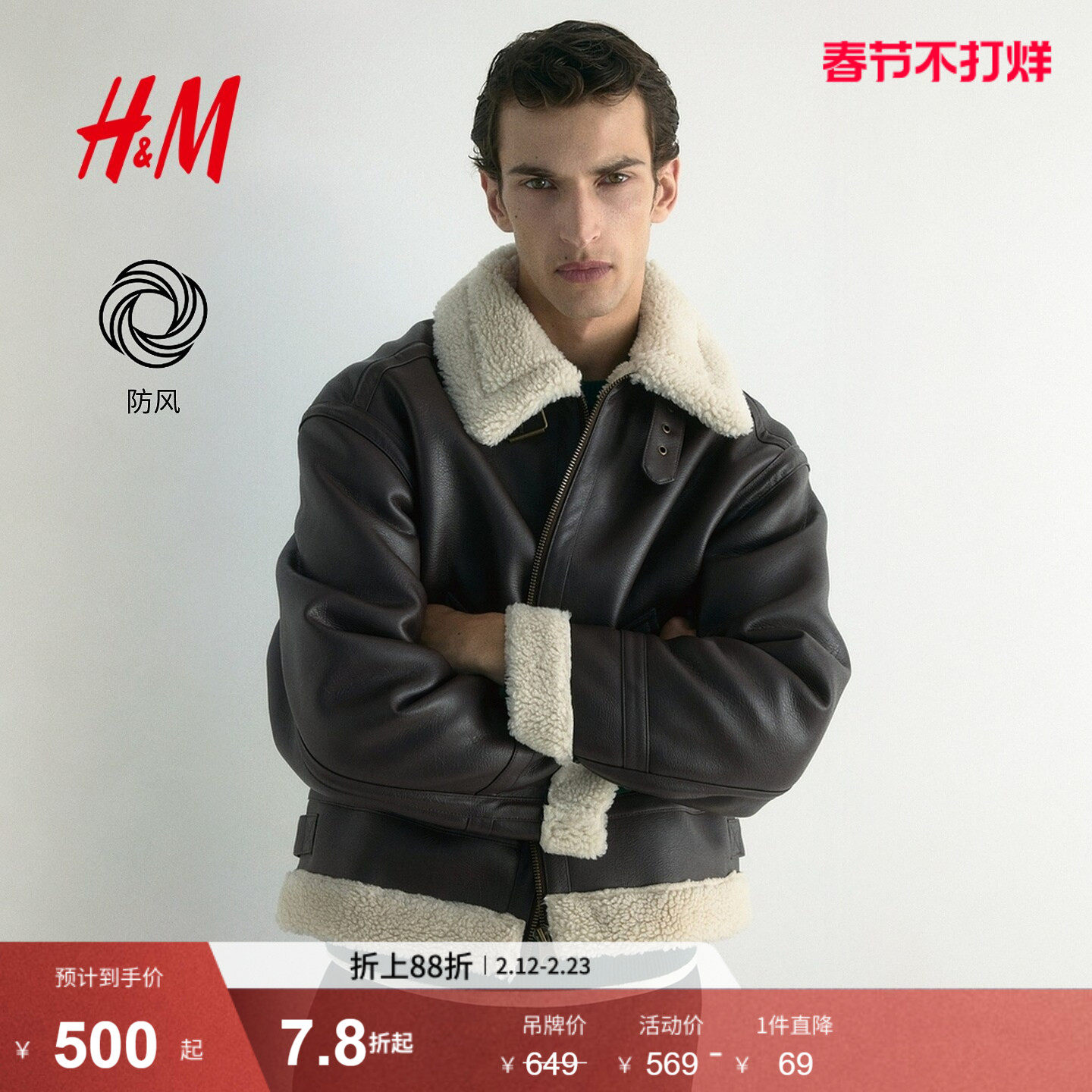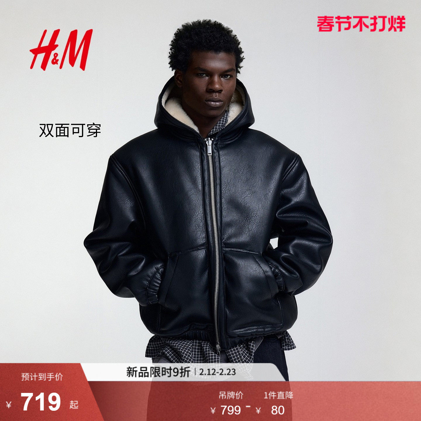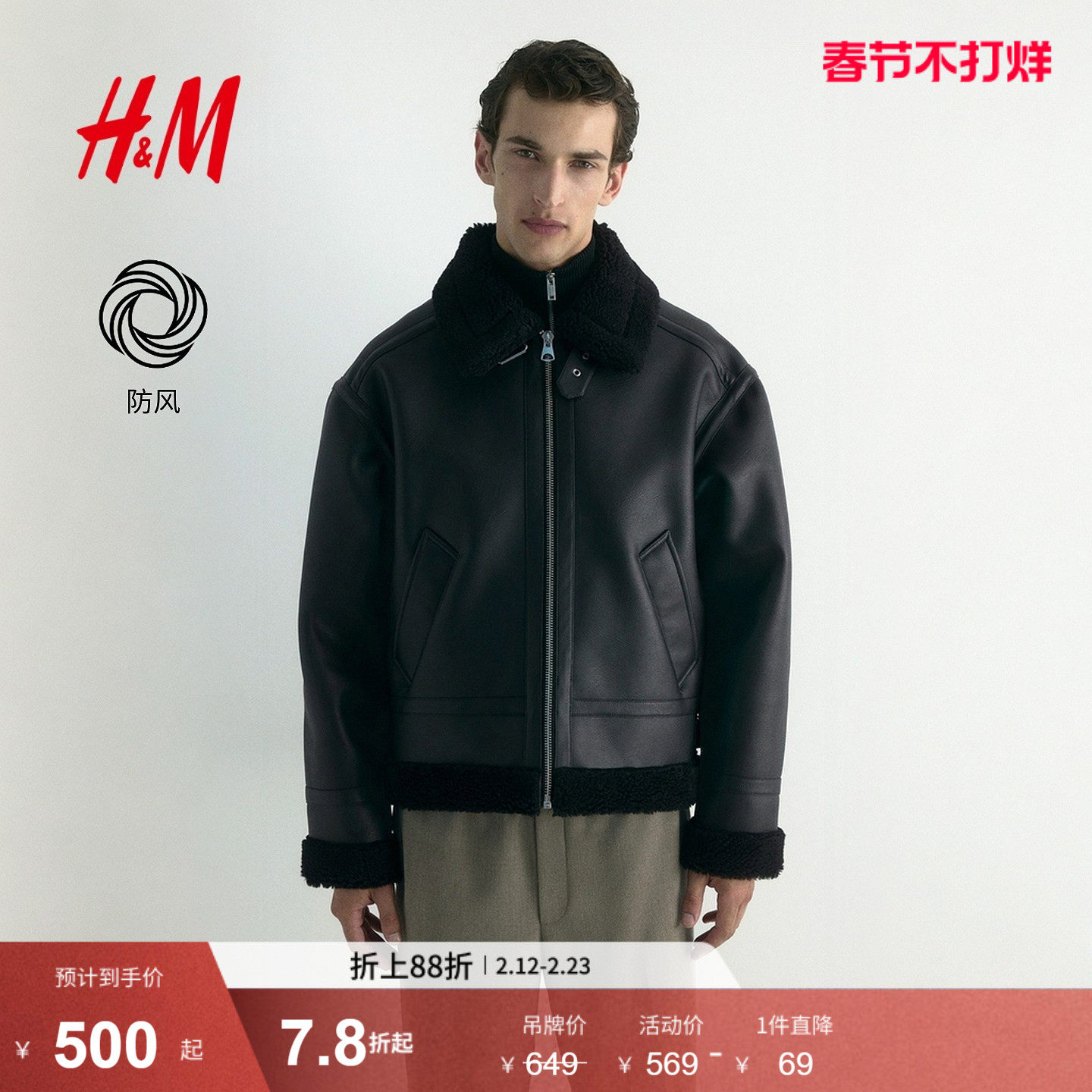 HM男装夹克春季双面可穿户外保暖仿皮草冬装飞行员外套1295943