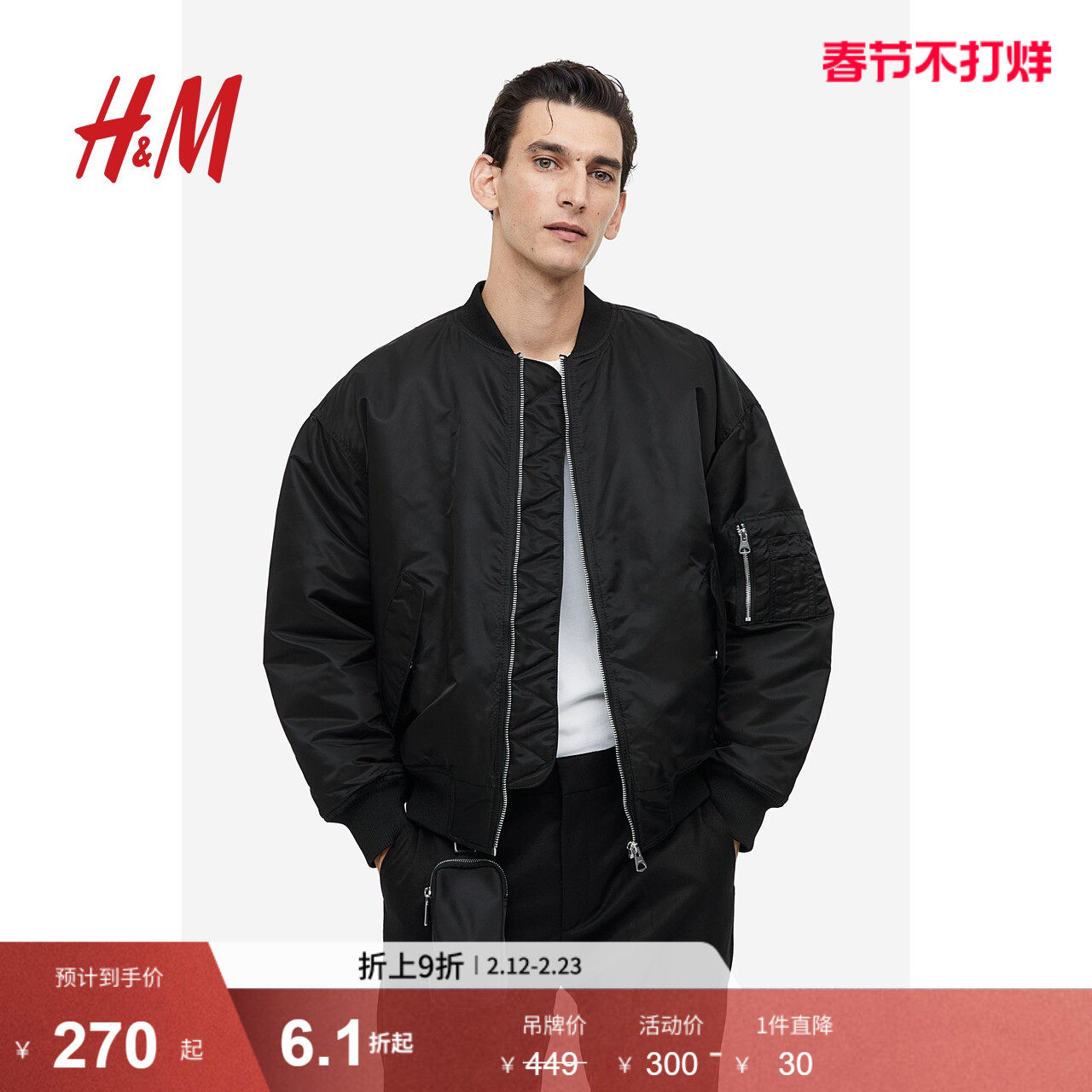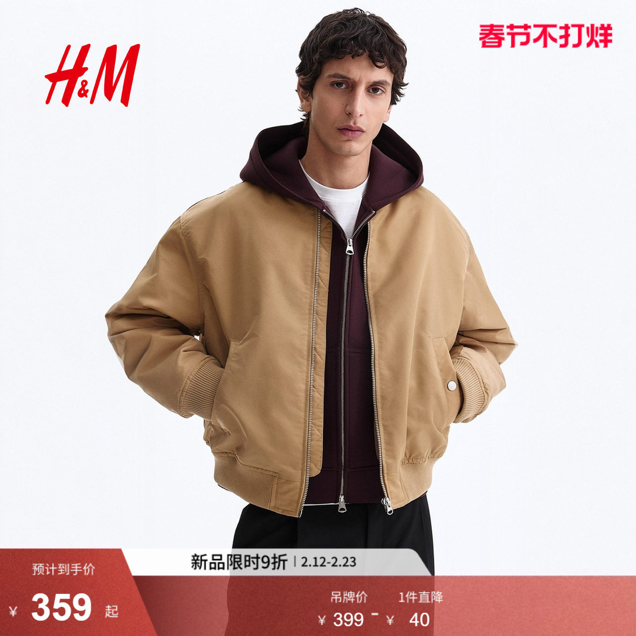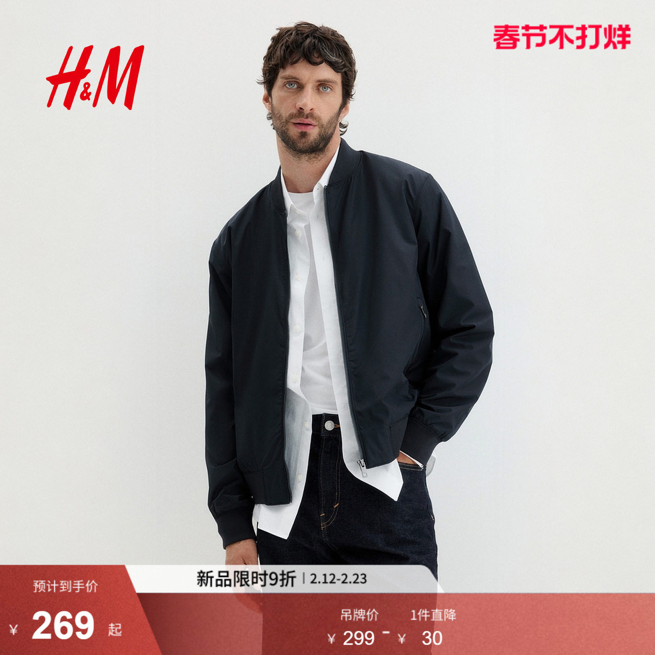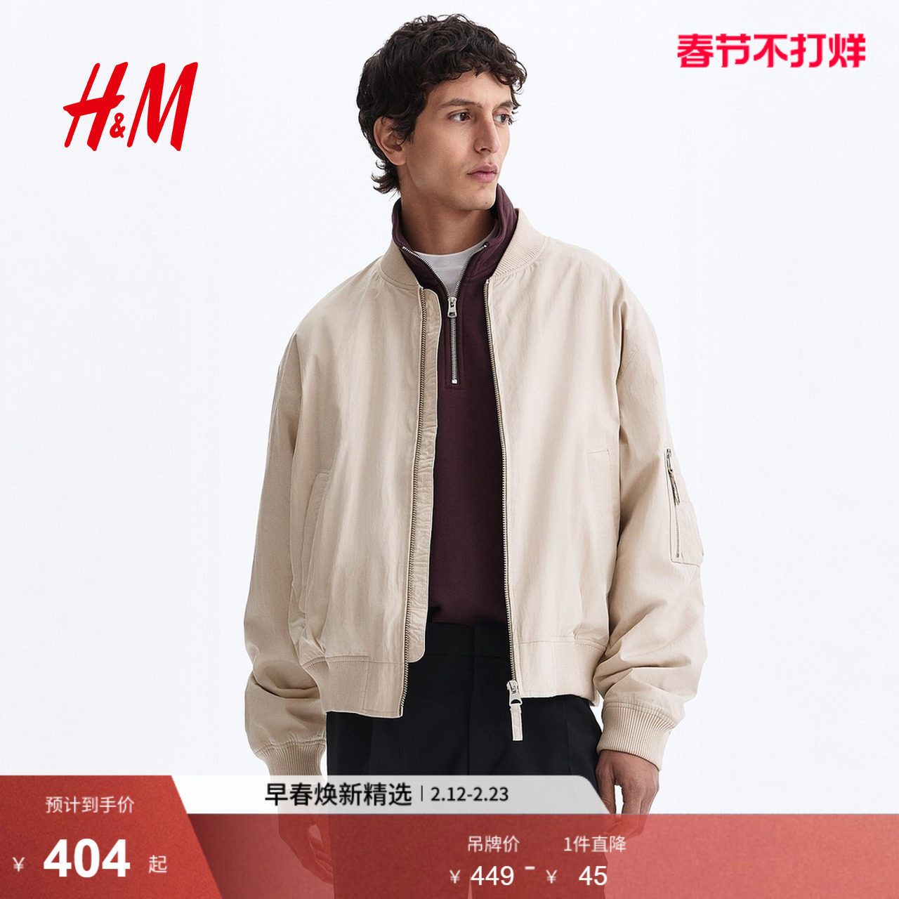 HM男装夹克2026春季新款轻便飞行员合身外出无帽拉链外套1318394
