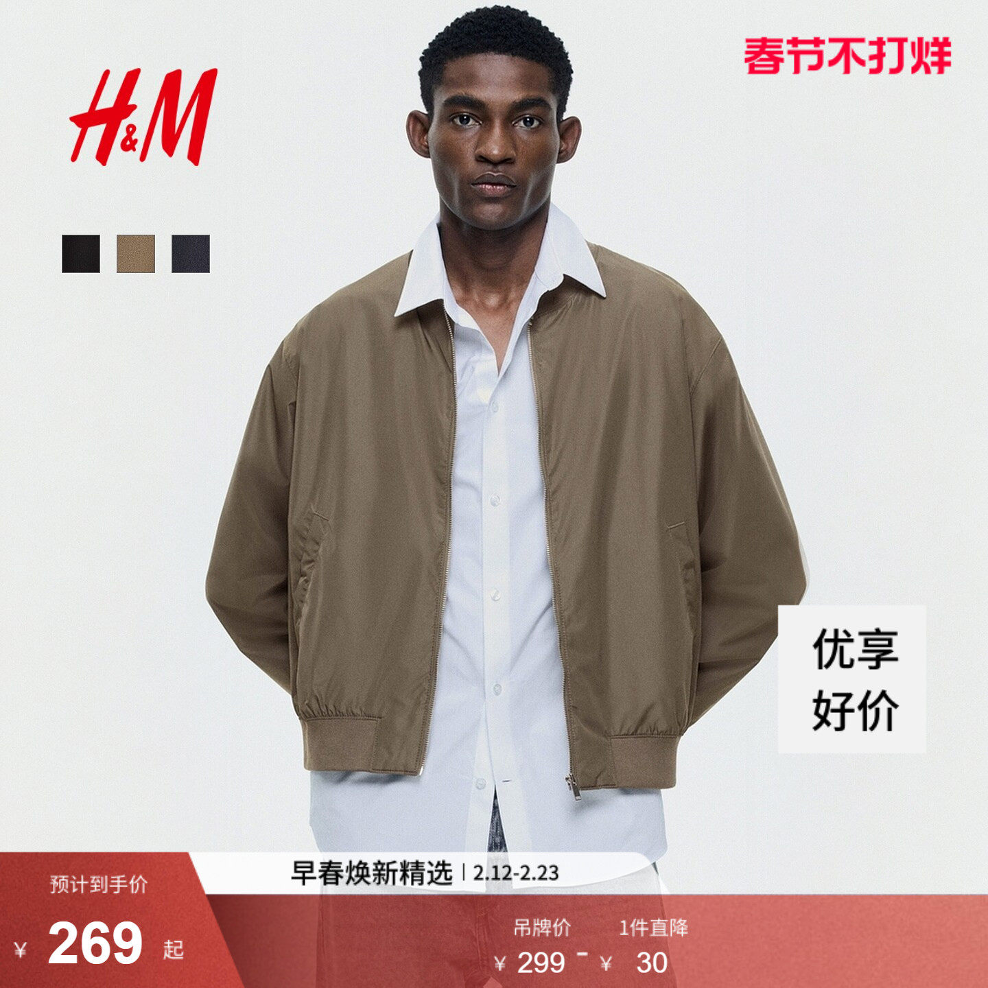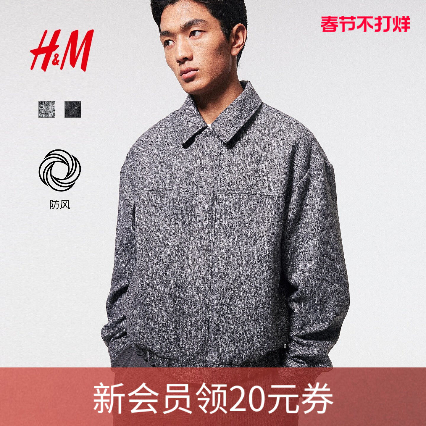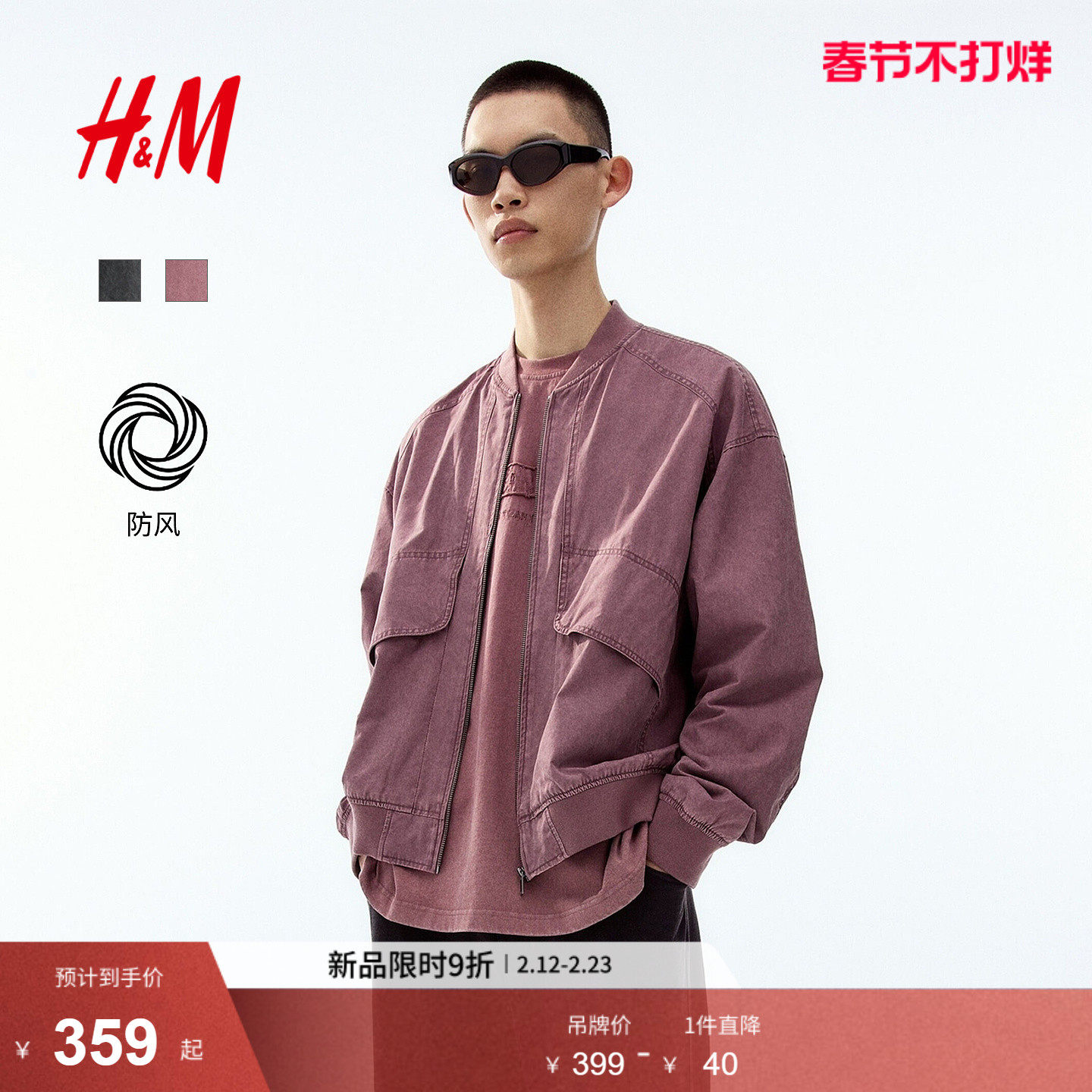 HM男装夹克2026春季新款轻便飞行员合身外出无帽拉链外套1318394