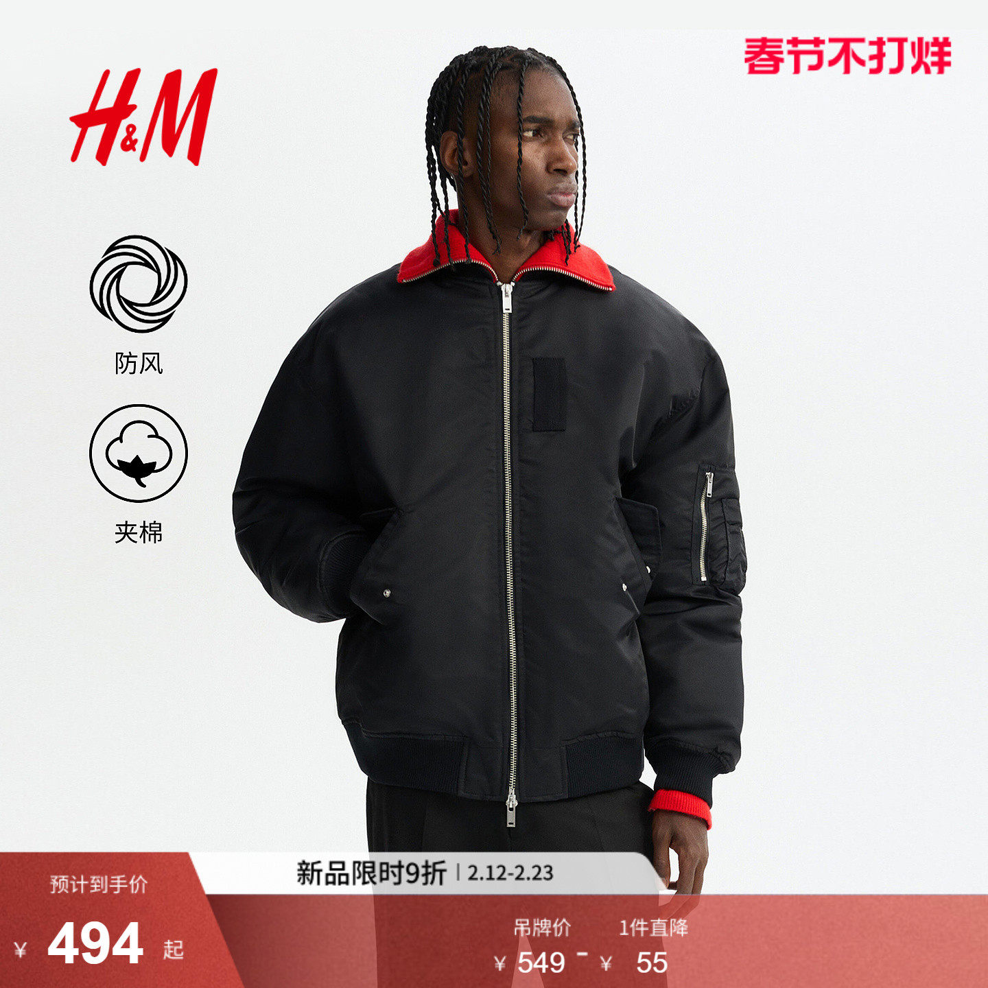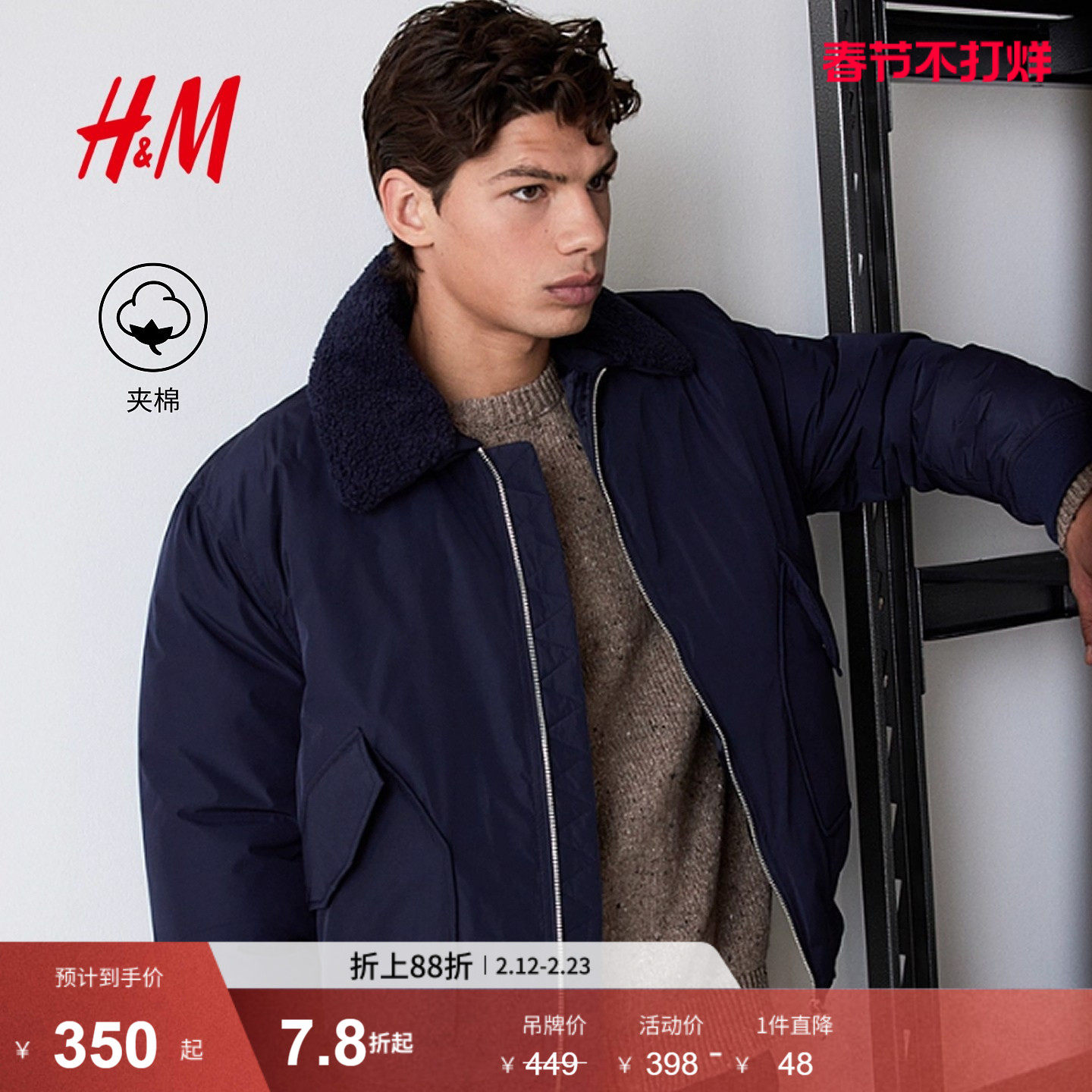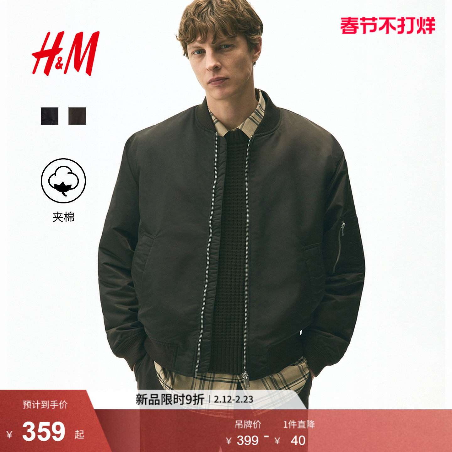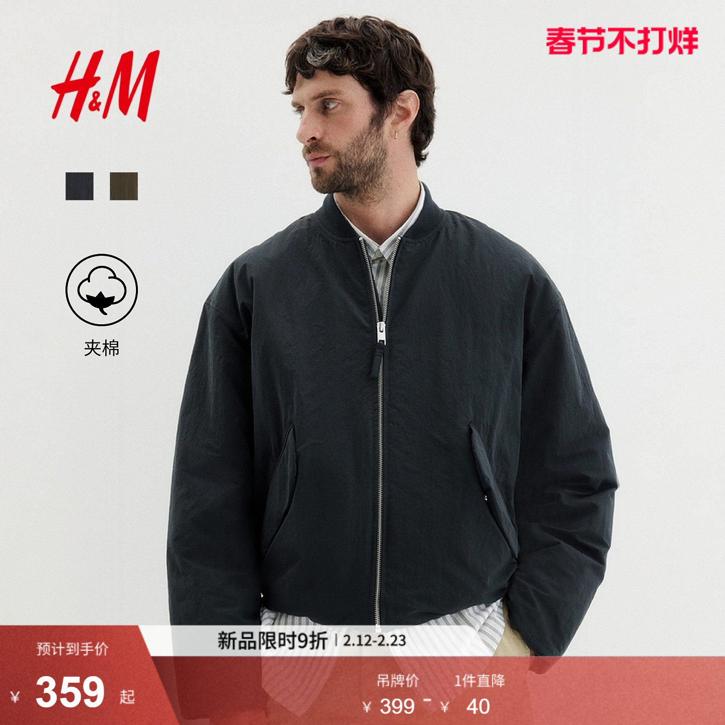 HM男装棉衣2026春季新款复古运动棉服夹棉保暖飞行员夹克1316590