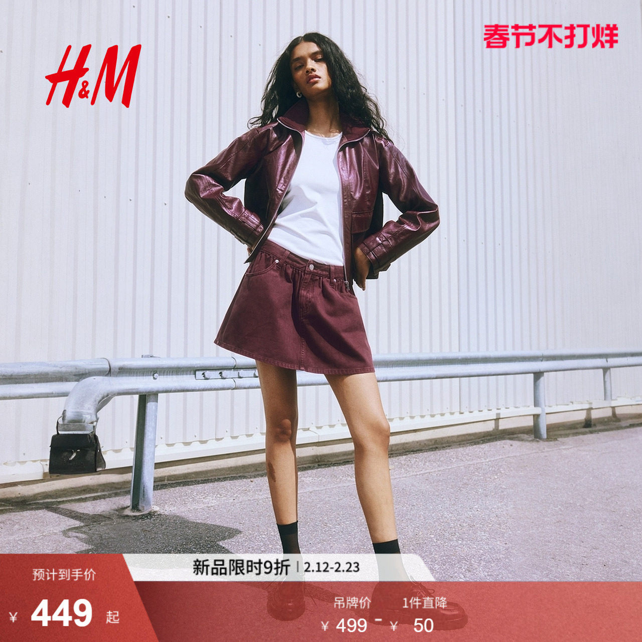HM女装短外套春季新款涂层短款口袋拉链飞行员酒红色夹克1294296