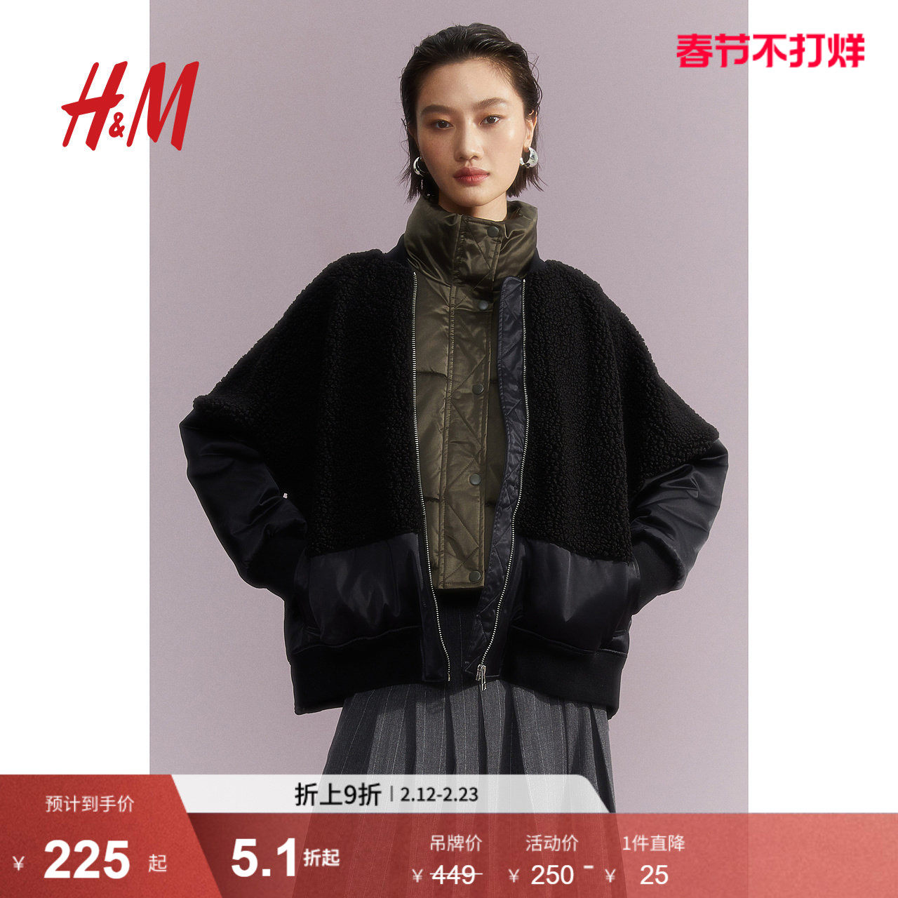 HM女装短外套春季舒适潮酷拼接泰迪绒飞行员夹克1211351