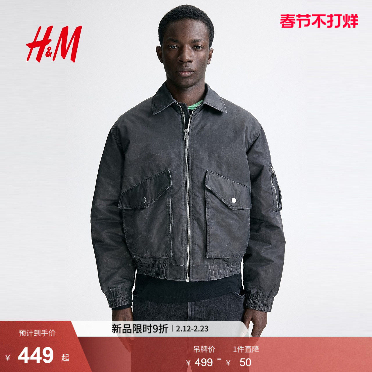 HM男装夹克春季新款工装风贴袋夹克水洗感飞行员夹克衫1309032