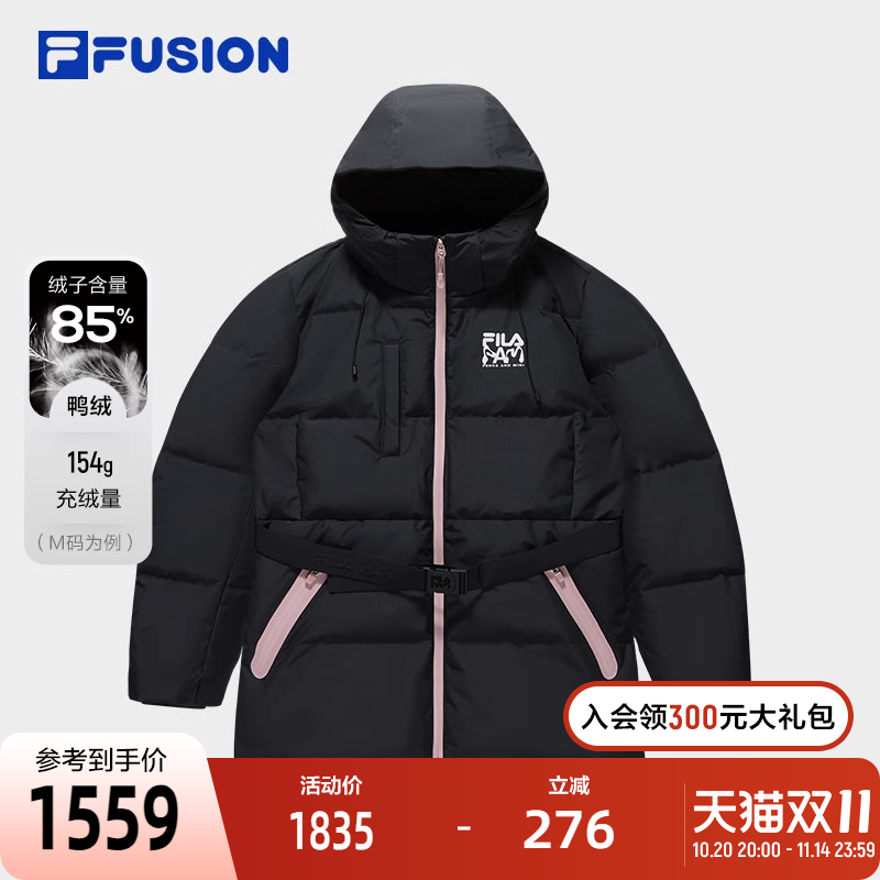 FILA FUSION斐乐潮牌中长款羽绒服女2024冬新款撞色收腰连帽外套