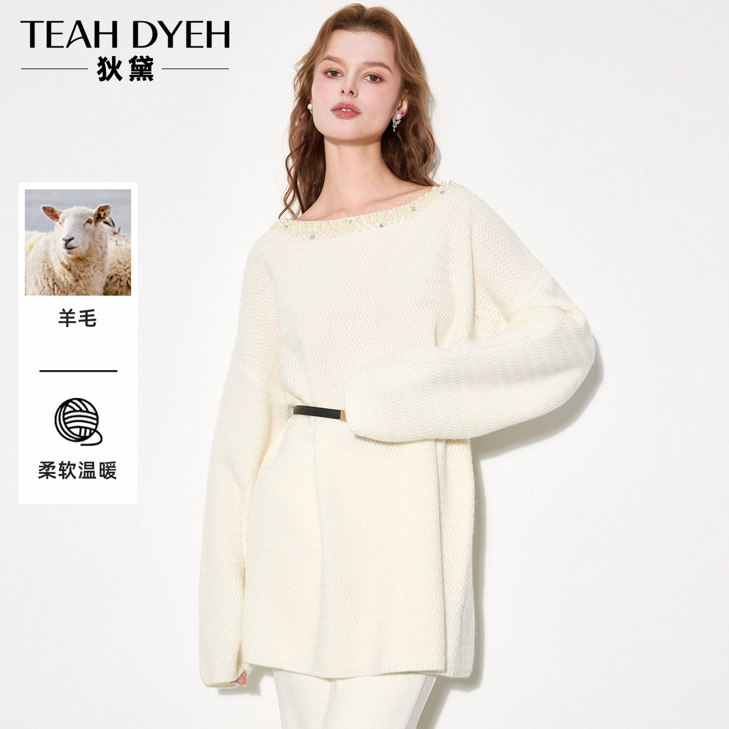 精致白月光!100%羊毛一字领钉珠中长款遮屁股毛衣收腰针织连衣裙