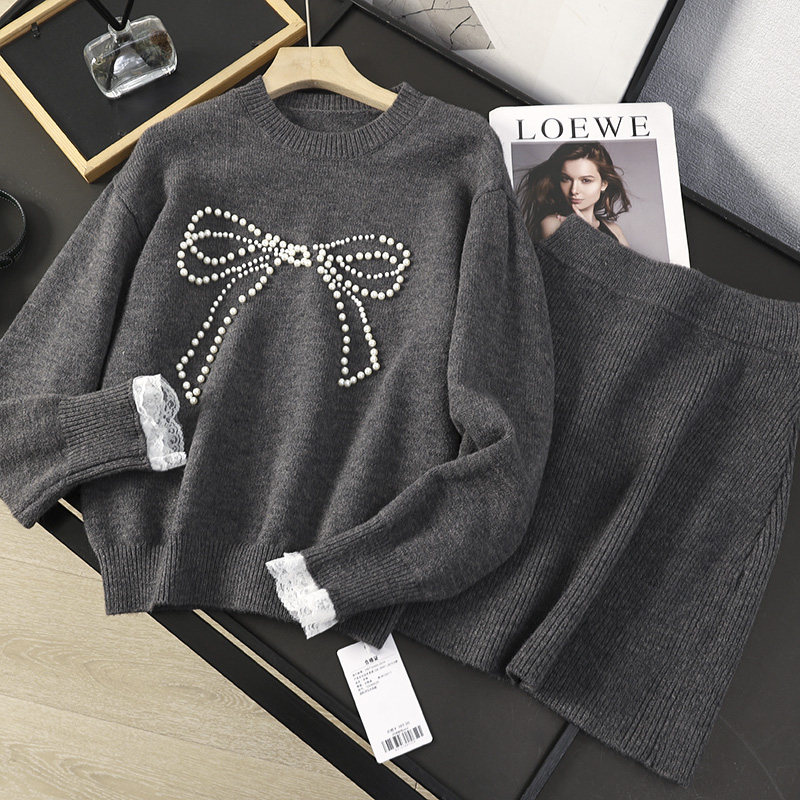 华子家 重工钉珠蝴蝶结蕾丝拼接针织衫半身裙两件套连衣裙女45864