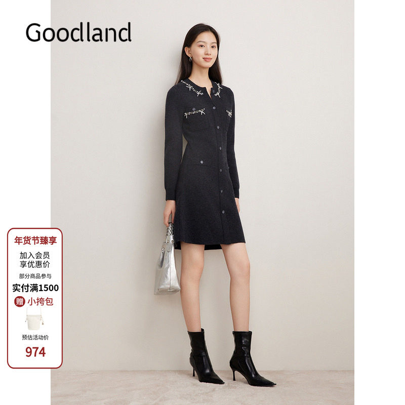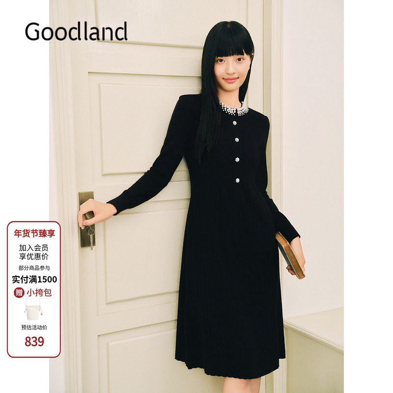 Goodland美地女装法式钉珠针织连衣裙收腰显瘦长款秋LC34306737