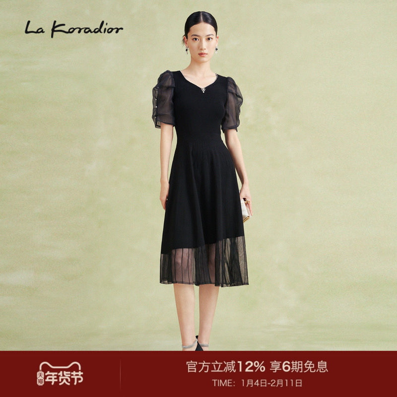 [商场同款]La Koradior拉珂蒂夏季法式洋装灯笼袖钉珠针织连衣裙