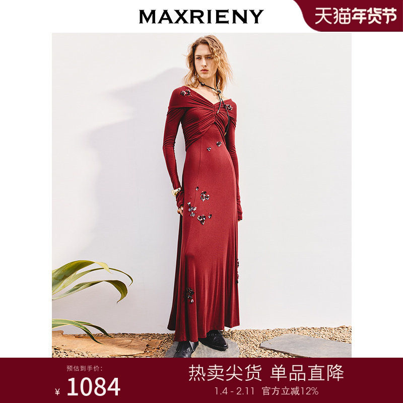 温柔风气质一字肩钉珠针织连衣裙女秋冬季红色珍珠长袖毛衣长裙子