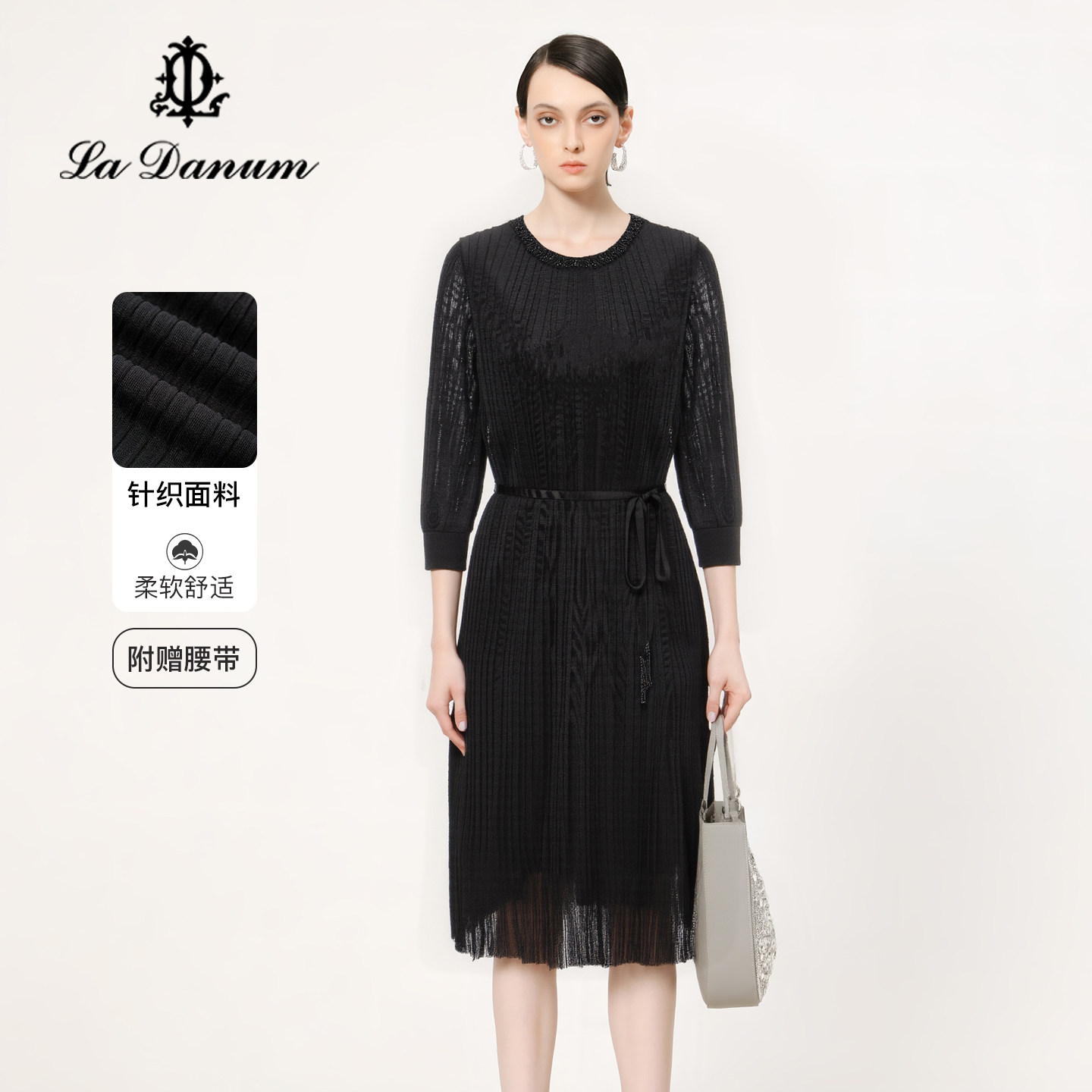 阿丹娜春夏黑色圆领钉珠针织连衣裙子长袖气质女装含腰带气质时尚
