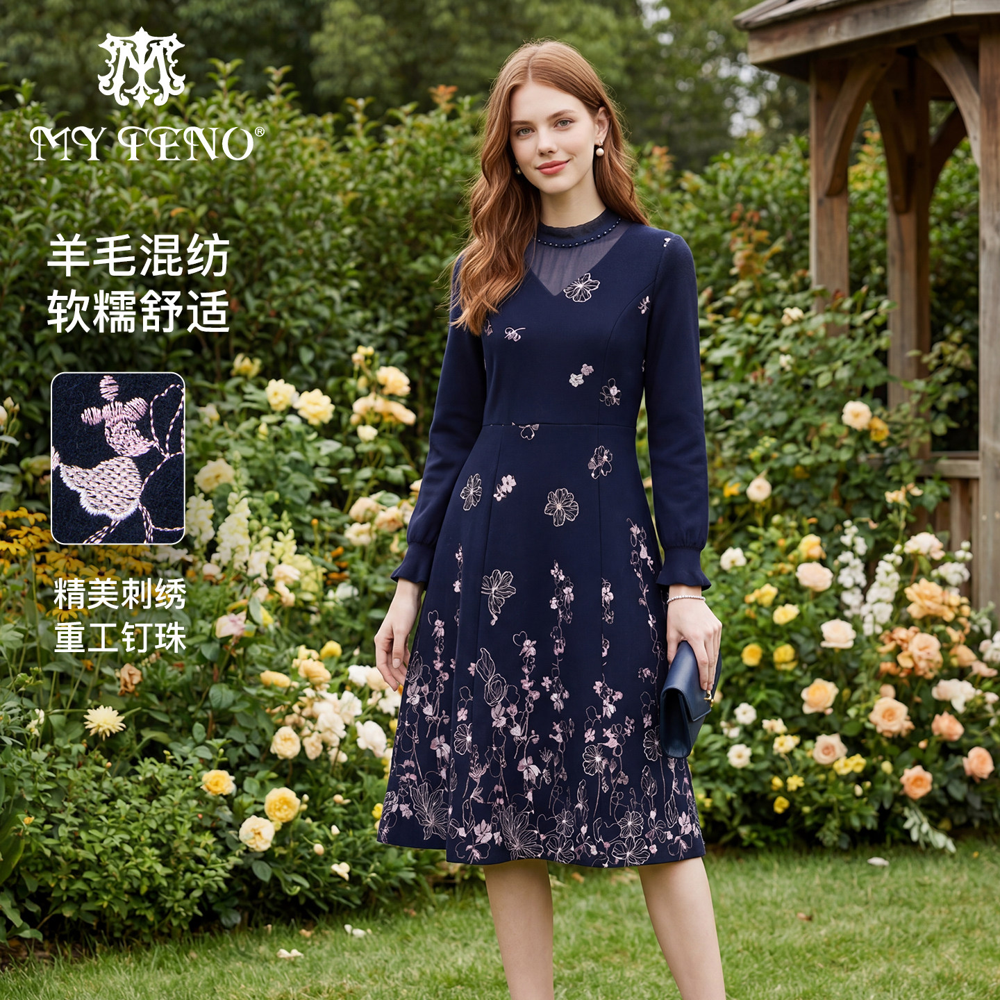 马天奴女装2025秋冬新款藏蓝羊毛混纺刺绣连衣裙子钉珠收腰针织袖